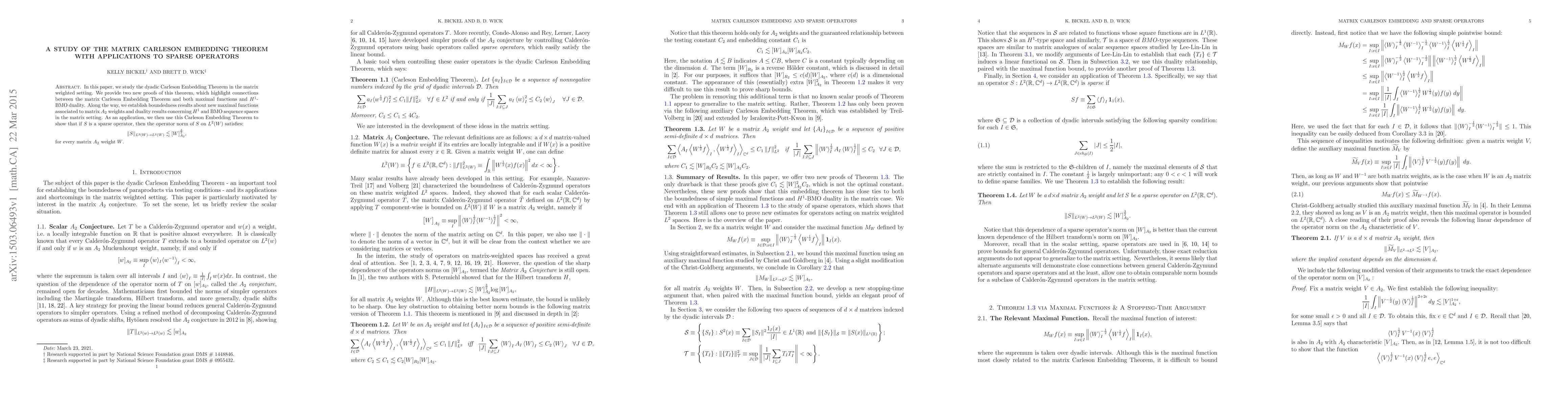 In this paper, we study the dyadic Carleson Embedding Theorem in the matrix weighted setting. We provide two new proofs of this theorem, which highlight connections between the matrix Carleson Embedding Theorem and both maximal functions and $H^1$-BMO duality. Along the way, we establish boundedness results about new maximal functions associated to matrix $A_2$ weights and duality results concerning $H^1$ and BMO sequence spaces in the matrix setting. As an application, we then use this Carleson Embedding Theorem to show that if $S$ is a sparse operator, then the operator norm of $S$ on $L^2(W)$ satisfies: \[ \| S\|_{L^2(W) \rightarrow L^2(W)} \lesssim [W]_{A_2}^{\frac{3}{2}},\] for every matrix $A_2$ weight $W$.