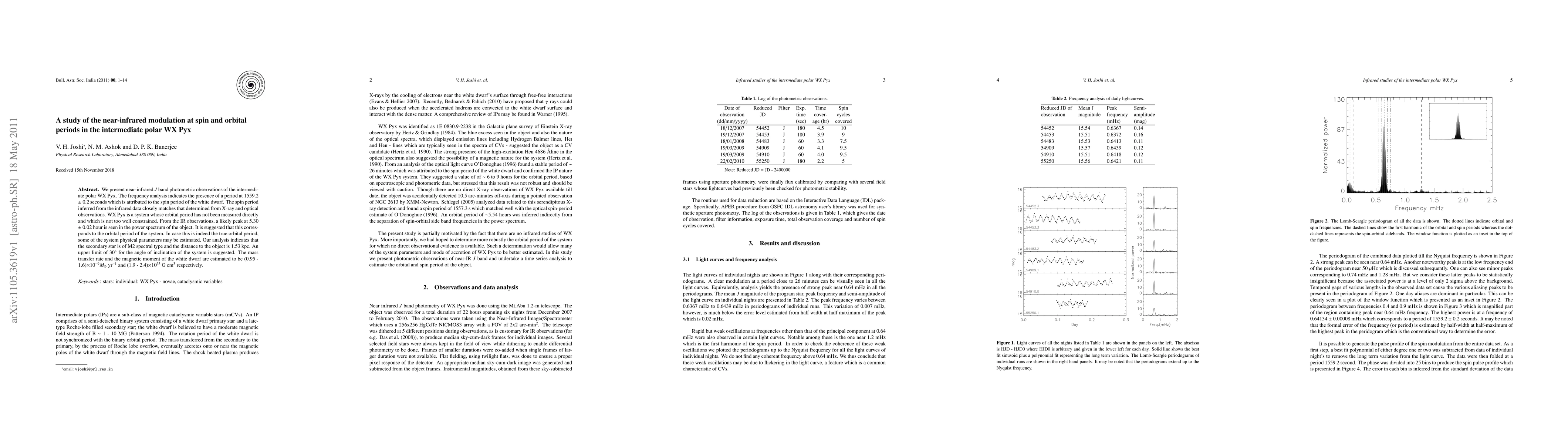 We present near-infrared $J$ band photometric observations of the intermediate polar WX Pyx. The frequency analysis indicates the presence of a period at 1559.2 $\pm$ 0.2 seconds which is attributed to the spin period of the white dwarf. The spin period inferred from the infrared data closely matches that determined from X-ray and optical observations. WX Pyx is a system whose orbital period has not been measured directly and which is not too well constrained. From the IR observations, a likely peak at 5.30 $\pm$ 0.02 hour is seen in the power spectrum of the object. It is suggested that this corresponds to the orbital period of the system. In case this is indeed the true orbital period, some of the system physical parameters may be estimated. Our analysis indicates that the secondary star is of M2 spectral type and the distance to the object is 1.53 kpc. An upper limit of 30$^\circ$ for the angle of inclination of the system is suggested. The mass transfer rate and the magnetic moment of the white dwarf are estimated to be (0.95 - 1.6)$\times 10^{-9} M_\odot$ yr$^{-1}$ and (1.9 - 2.4)$ \times 10^{33}$ G cm$^{3}$ respectively.
