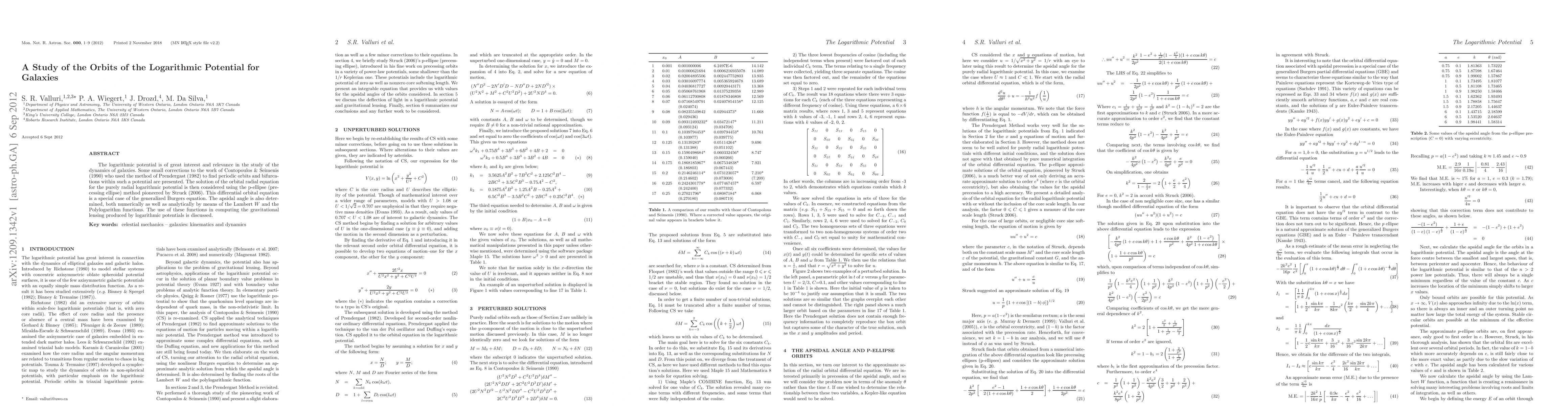 This paper refines the study of galactic orbits under logarithmic potentials, correcting previous work and employing the p-ellipse method to solve the orbital radial equation. It also determines the apsidal angle analytically and numerically, discussing applications to gravitational lensing.