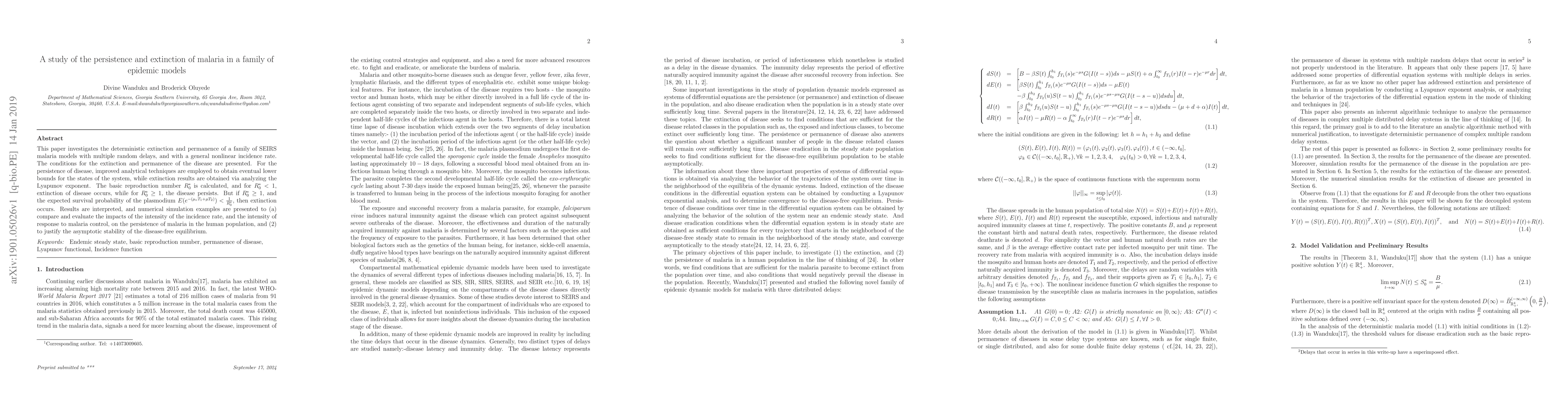 This paper examines the extinction and persistence of malaria using a family of SEIRS models with varying delays and nonlinear incidence rates. It finds that disease extinction occurs if the basic reproduction number $R^{*}_{0}<1$, while persistence happens if $R^{*}_{0}\geq 1$ unless certain survival conditions are met. Numerical simulations assess the impact of incidence rate intensity and malaria control response.