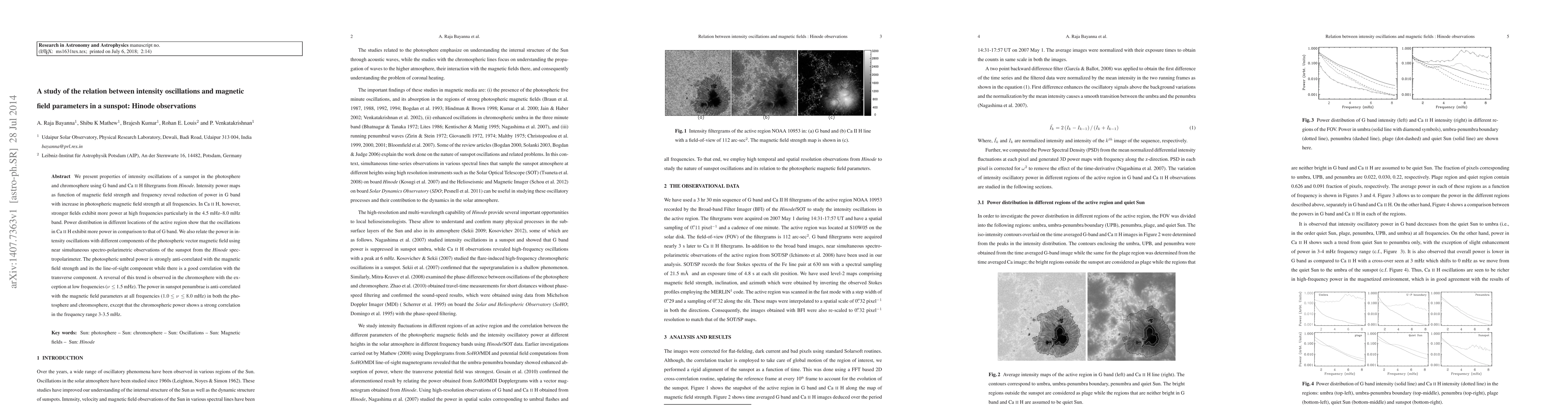 This study investigates intensity oscillations in a sunspot using Hinode observations, revealing that G-band oscillations decrease with stronger photospheric magnetic fields, while CaIIH oscillations show increased power in stronger fields, especially at higher frequencies. The umbral power correlates inversely with magnetic field strength and its line-of-sight component, but positively with the transverse component, with a reversal observed in the chromosphere.