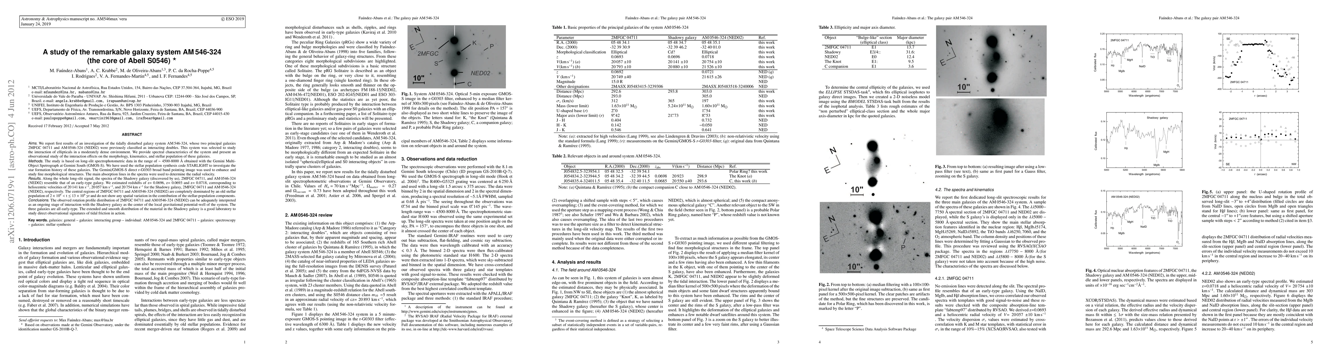 We report first results of an investigation of the tidally disturbed galaxy system AM\,546-324, whose two principal galaxies 2MFGC 04711 and AM\,0546-324 (NED02) were previously classified as interacting doubles. This system was selected to study the interaction of ellipticals in a moderately dense environment. We provide spectral characteristics of the system and present an observational study of the interaction effects on the morphology, kinematics, and stellar population of these galaxies. The study is based on long-slit spectrophotometric data in the range of $\sim$ 4500-8000 $\AA$ obtained with the Gemini Multi-Object Spetrograph at Gemini South (GMOS-S). We have used the stellar population synthesis code STARLIGHT to investigate the star formation history of these galaxies. The Gemini/GMOS-S direct r-G0303 broad band pointing image was used to enhance and study fine morphological structures. The main absorption lines in the spectra were used to determine the radial velocity. Along the whole long-slit signal, the spectra of the Shadowy galaxy (discovered by us), 2MFGC 04711, and AM\,0546-324 (NED02) resemble that of an early-type galaxy. We estimated redshifts of z= 0.0696, z= 0.0693 and z= 0.0718, corresponding to heliocentric velocities of 20\,141 km s$^{-1}$, 20\,057 km s$^{-1}$, and 20\,754 km s$^{-1}$ for the Shadowy galaxy, 2MFGC 04711 and AM\,0546-324 (NED02), respectively. ...