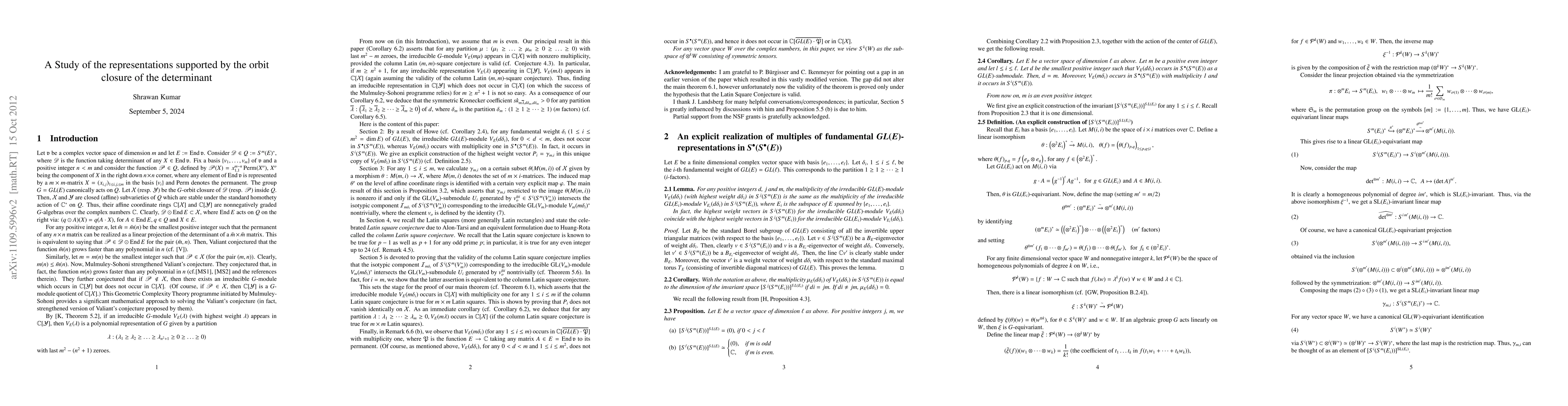 We show the existence of a large family of representations supported by the orbit closure of the determinant. However, the validity of our result is based on the validity of the celebrated `Latin Square Conjecture' due to Alon-Tarsi or more precisely on the validity of an equivalent `column Latin Square Conjecture' due to Huang-Rota.