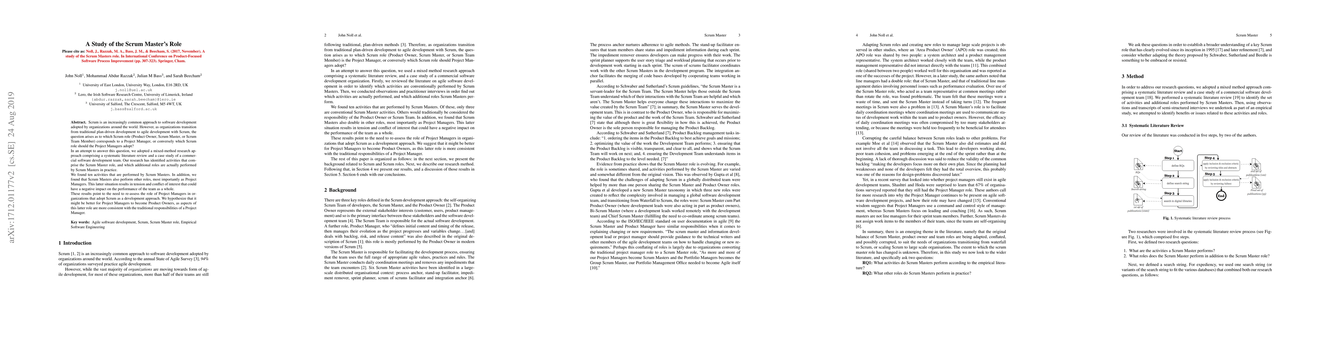This study investigates the role of Scrum Masters in agile software development, identifying nine key activities they perform and noting that Scrum Masters often also act as Project Managers, leading to potential conflicts of interest. The research suggests that Project Managers might be better suited to the Product Owner role in Scrum.