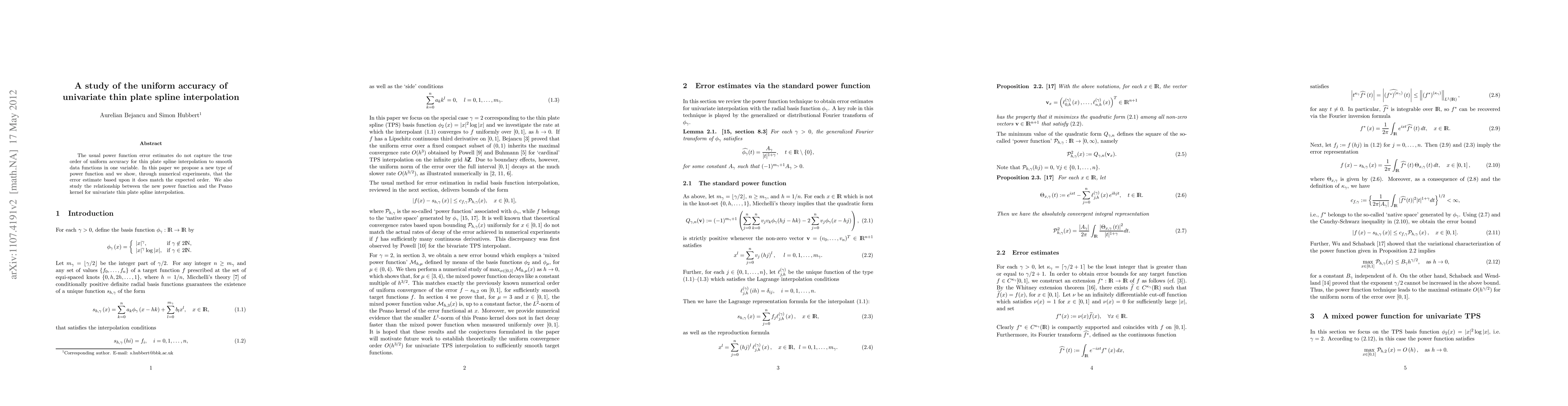 This paper proposes a novel power function to better estimate the uniform accuracy of univariate thin plate spline interpolation, demonstrating through numerical experiments that it matches the expected error order. It also explores the connection between this new function and the Peano kernel.