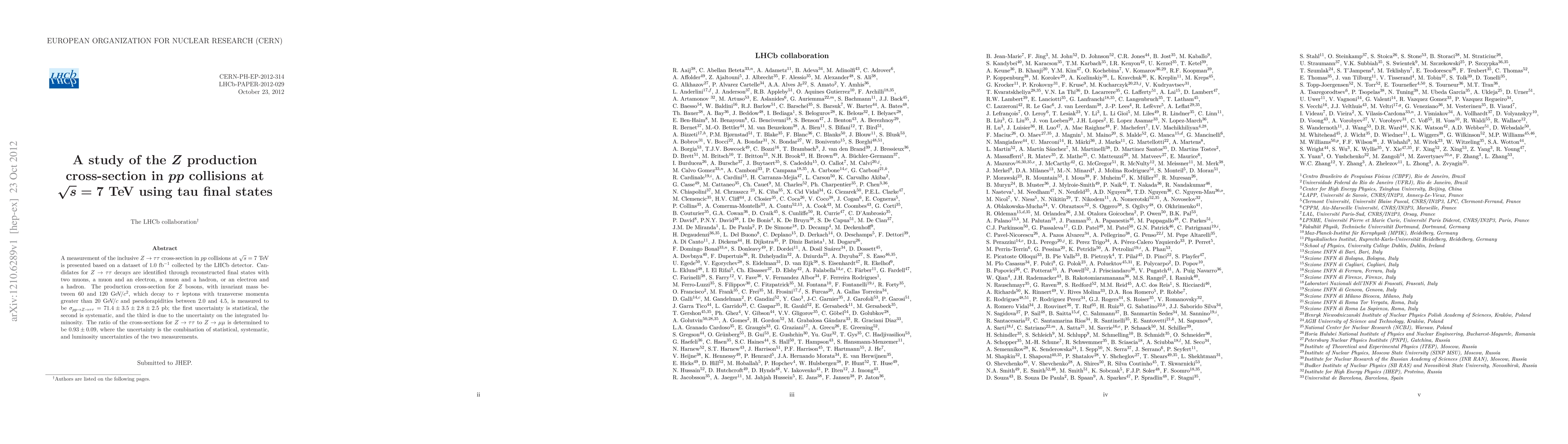 Researchers measured the $Z$ boson production cross-section in proton-proton collisions at 7 TeV using tau final states, finding a cross-section of 71.4 pb with significant statistical, systematic, and luminosity uncertainties.
