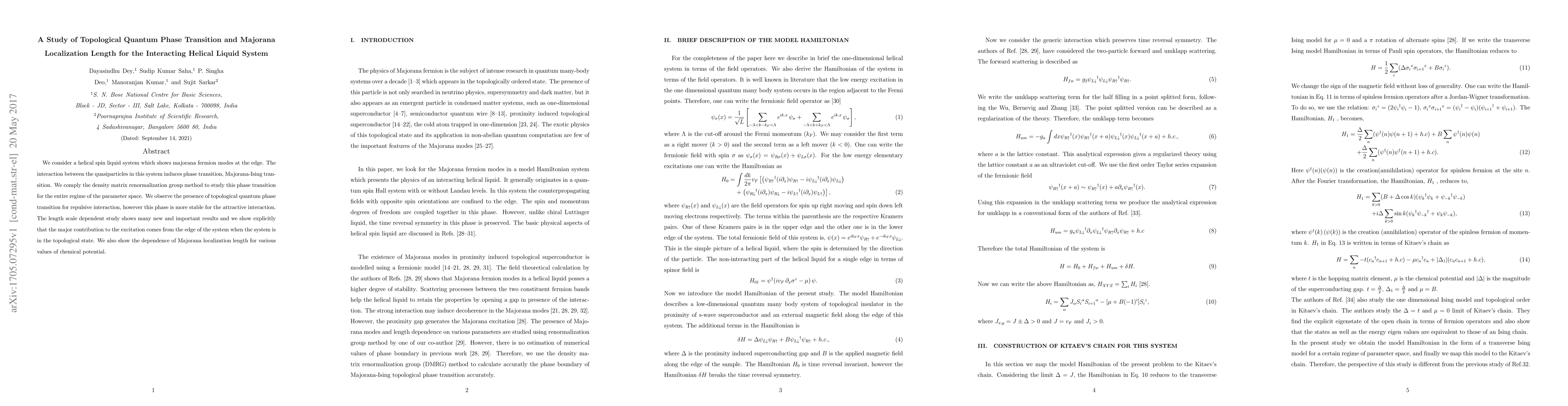 We consider a helical spin liquid system which shows majorana fermion modes at the edge. The interaction between the quasiparticles in this system induces phase transition, Majorana-Ising transition. We comply the density matrix renormalization group method to study this phase transition for the entire regime of the parameter space. We observe the presence of topological quantum phase transition for repulsive interaction, however this phase is more stable for the attractive interaction. The length scale dependent study shows many new and important results and we show explicitly that the major contribution to the excitation comes from the edge of the system when the system is in the topological state. We also show the dependence of Majorana localization length for various values of chemical potential.