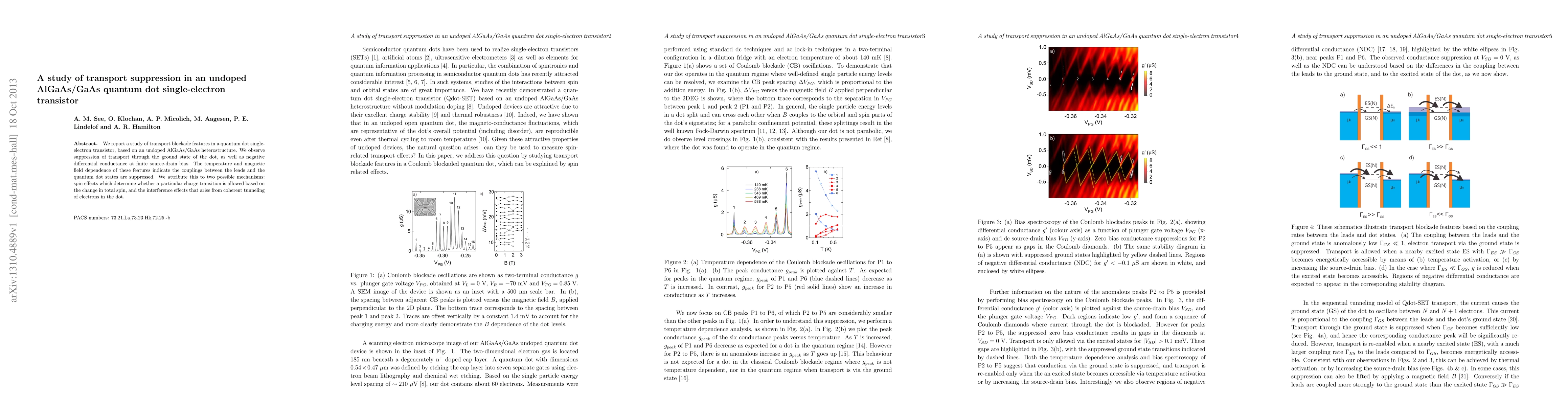 This study investigates transport suppression in an undoped AlGaAs/GaAs quantum dot single-electron transistor, revealing transport blockade and negative differential conductance due to spin and interference effects that suppress coupling between the dot and leads. Temperature and magnetic field dependencies suggest these effects are influenced by spin transitions and coherent electron tunneling.