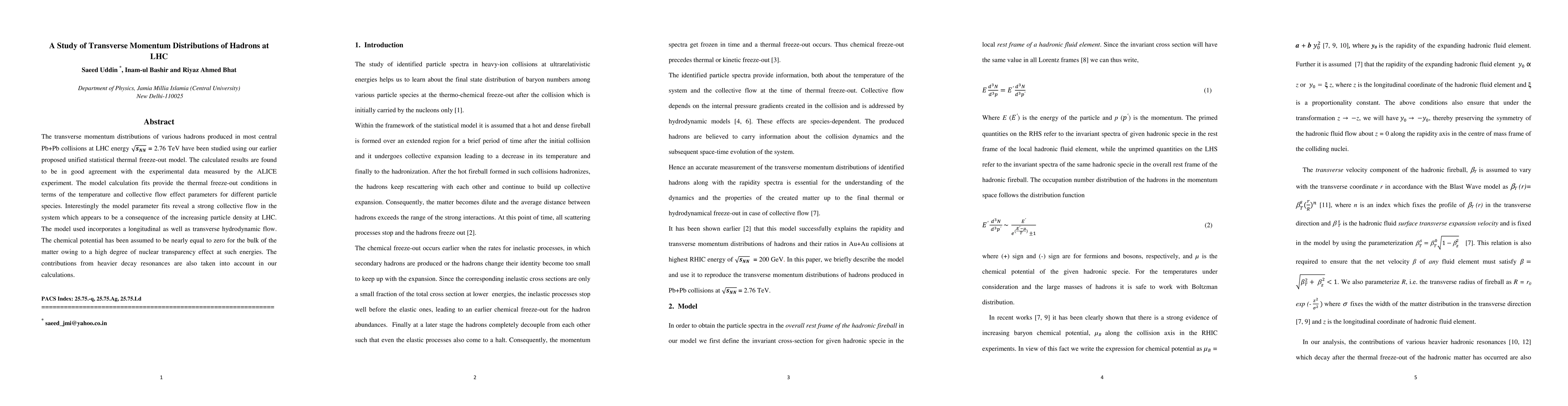 The transverse momentum distributions of various hadrons produced in most central Pb+Pb collisions at LHC energy Root(s_NN) = 2.76 TeV have been studied using our earlier proposed unified statistical thermal freeze-out model. The calculated results are found to be in good agreement with the experimental data measured by the ALICE experiment. The model calculation fits provide the thermal freeze-out conditions in terms of the temperature and collective flow effect parameters for different particle species. Interestingly the model parameter fits reveal a strong collective flow in the system which appears to be a consequence of the increasing particle density at LHC. The model used incorporates a longitudinal as well as transverse hydrodynamic flow. The chemical potential has been assumed to be nearly equal to zero for the bulk of the matter owing to a high degree of nuclear transparency effect at such energies. The contributions from heavier decay resonances are also taken into account in our calculations.
