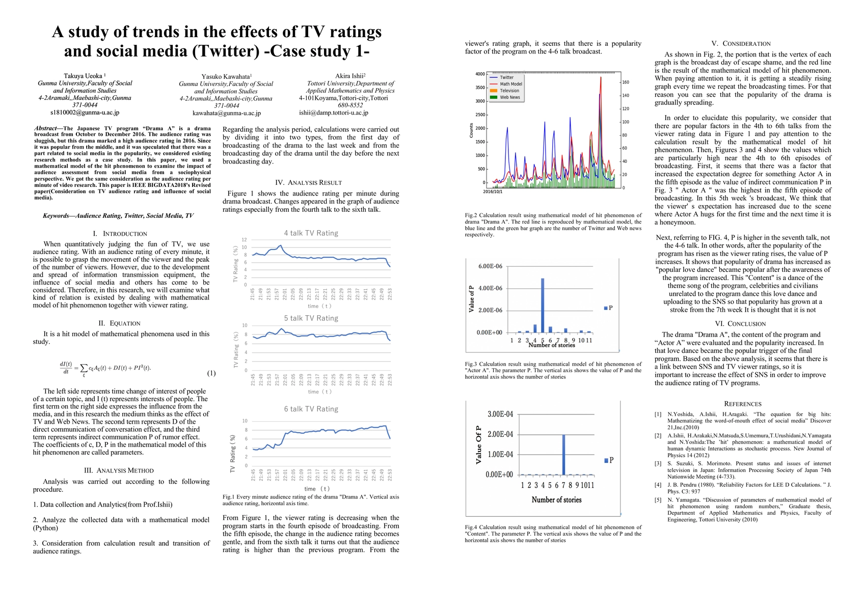 The Japanese TV program 'Drama A' is a drama broadcast from October to December 2016. The audience rating was sluggish, but this drama marked a high audience rating in 2016. Since it was popular from the middle, and it was speculated that there was a part related to social media in the popularity, we considered existing research methods as a case study. In this paper, we used a mathematical model of the hit phenomenon to examine the impact of audience assessment from social media from a sociophysical perspective. We got the same consideration as the audience rating per minute of video research. This paper is IEEE BIGDATA2018's Revised paper(Consideration on TV audience rating and influence of social media).
