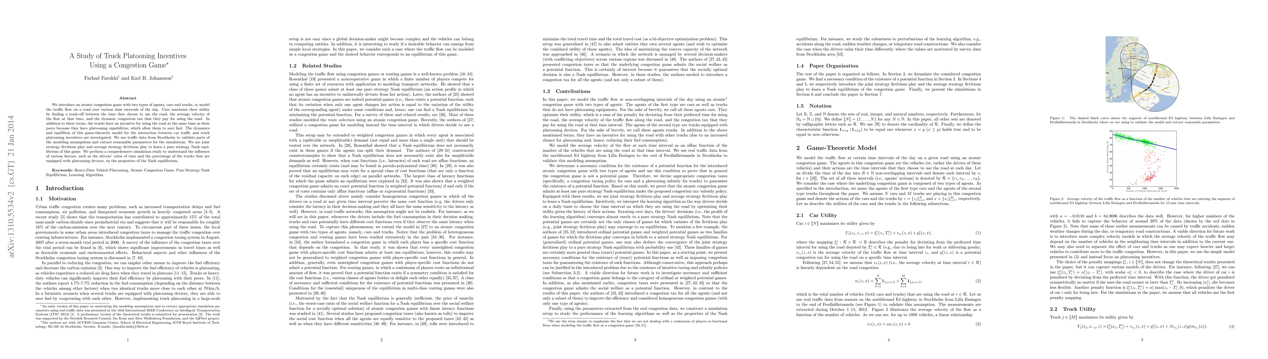This study investigates truck platooning incentives using a congestion game, exploring how drivers' values of time and platooning device usage affect traffic flow. It uses real-world data from Stockholm to validate assumptions and finds the optimal Nash equilibrium for car-truck interactions.