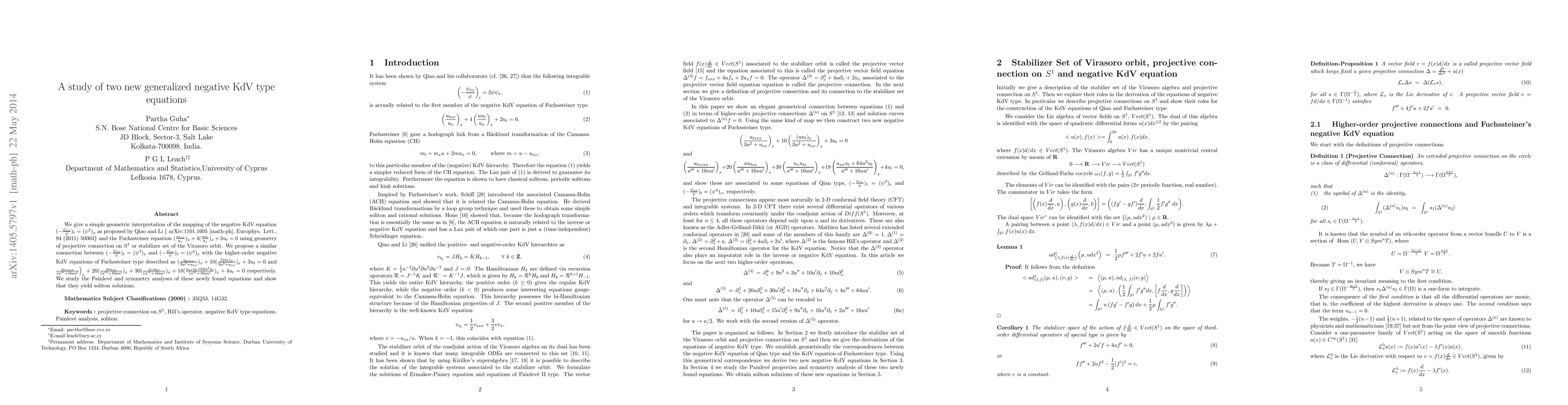 We give a simple geometric interpretation of the mapping of the negative KdV equation as proposed by Qiao and Li {arXiv:1101.1605 [math-ph], Europhys. Lett.,94 (2011) 50003} and the Fuchssteiner equation using geometry of projective connection on S1 or stabilizer set of the Virasoro orbit. We propose a similar connection between with the higher-order negative KdV equations of Fuchssteiner type described as and respectively. We study the Painleve and symmetry analyses of these newly found equations and show that they yield soliton solutions.