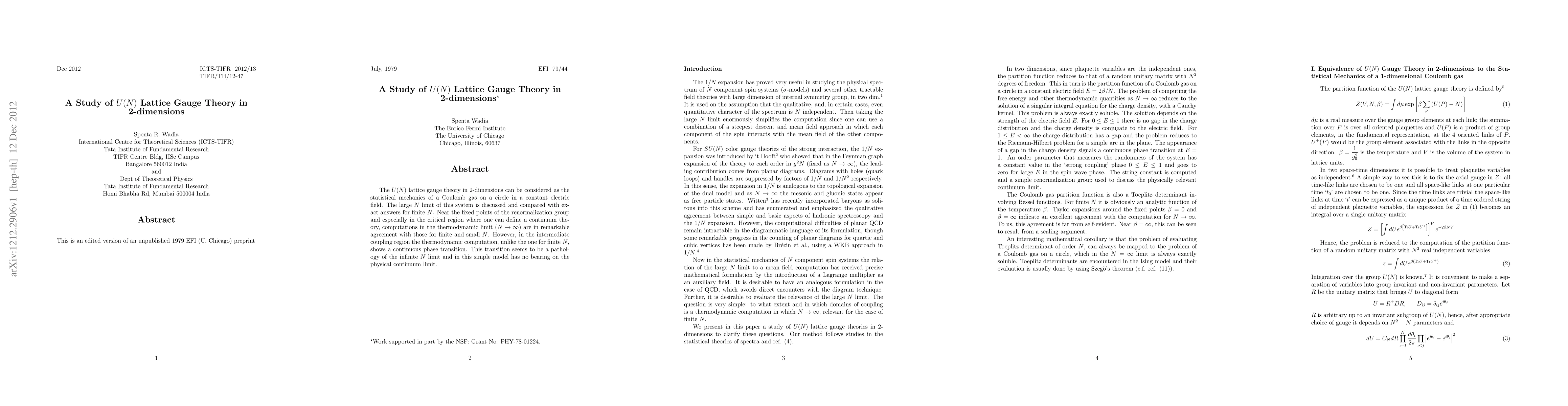 This is an edited version of an unpublished 1979 EFI (U. Chicago) preprint: "The U(N) lattice gauge theory in 2-dimensions can be considered as the statistical mechanics of a Coulomb gas on a circle in a constant electric field. The large N limit of this system is discussed and compared with exact answers for finite N. Near the fixed points of the renormalization group and especially in the critical region where one can define a continuum theory, computations in the thermodynamic limit $(N \rightarrow \infty)$ are in remarkable agreement with those for finite and small N. However, in the intermediate coupling region the thermodynamic computation, unlike the one for finite N, shows a continuous phase transition. This transition seems to be a pathology of the infinite N limit and in this simple model has no bearing on the physical continuum limit."