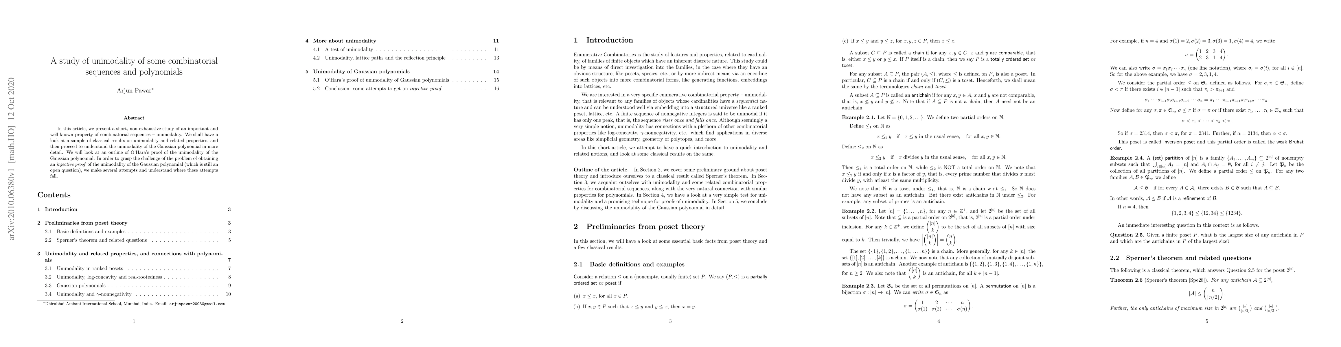 In this article, we present a short, non-exhaustive study of an important and well-known property of combinatorial sequences - unimodality. We shall have a look at a sample of classical results on unimodality and related properties, and then proceed to understand the unimodality of the Gaussian polynomial in more detail. We will look at an outline of O'Hara's proof of the unimodality of the Gaussian polynomial. In order to grasp the challenge of the problem of obtaining an injective proof of the unimodality of the Gaussian polynomial (which is still an open question), we make several attempts and understand where these attempts fail.