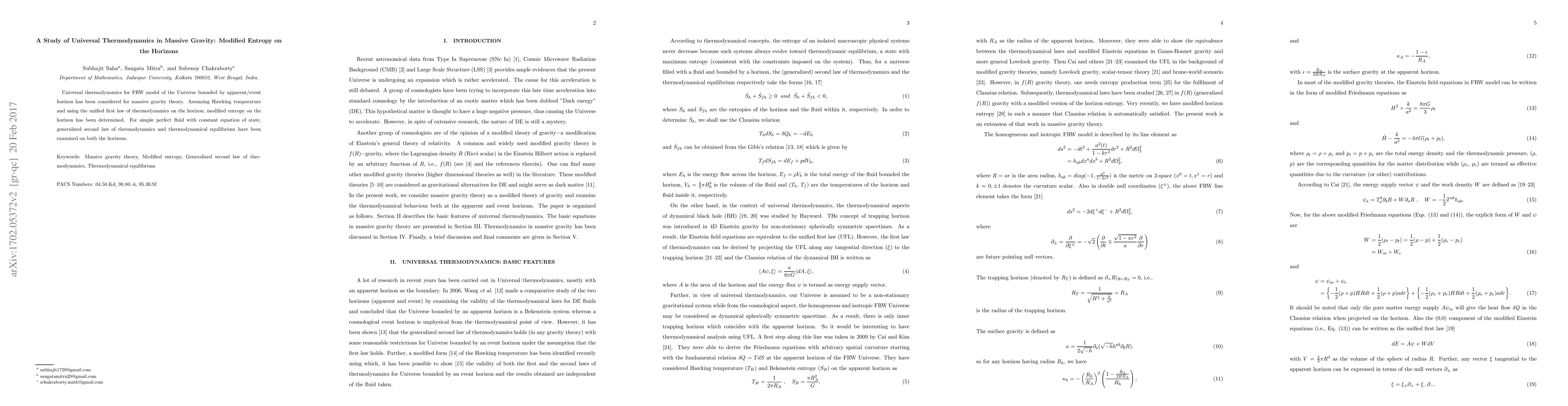 Universal thermodynamics for FRW model of the Universe bounded by apparent/event horizon has been considered for massive gravity theory. Assuming Hawking temperature and using the unified first law of thermodynamics on the horizon, modified entropy on the horizon has been determined. For simple perfect fluid with constant equation of state, generalized second law of thermodynamics and thermodynamical equilibrium have been examined on both the horizons.