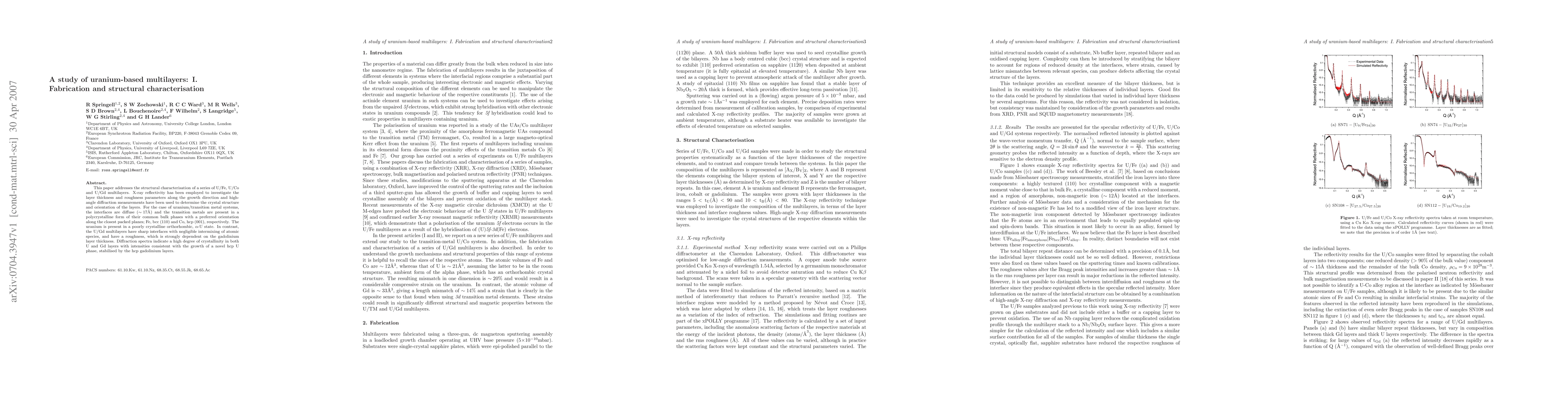 This paper addresses the structural characterisation of a series of U/Fe, U/Co and U/Gd multilayers. X-ray reflectivity has been employed to investigate the layer thickness and roughness parameters along the growth direction and high-angle diffraction measurements have been used to determine the crystal structure and orientation of the layers. For the case of uranium/transition metal systems, the interfaces are diffuse and the transition metals are present in a polycrystalline form of their common bulk phases with a preferred orientation along the closest packed planes; Fe, bcc (110) and Co, hcp (001), respectively. The uranium is present in a poorly crystalline orthorhombic, alpha-U state. In contrast, the U/Gd multilayers have sharp interfaces with negligible intermixing of atomic species, and have a roughness, which is strongly dependent on the gadolinium layer thickness. Diffraction spectra indicate a high degree of crystallinity in both U and Gd layers with intensities consistent with the growth of a novel hcp U phase, stabilised by the hcp gadolinium layers.