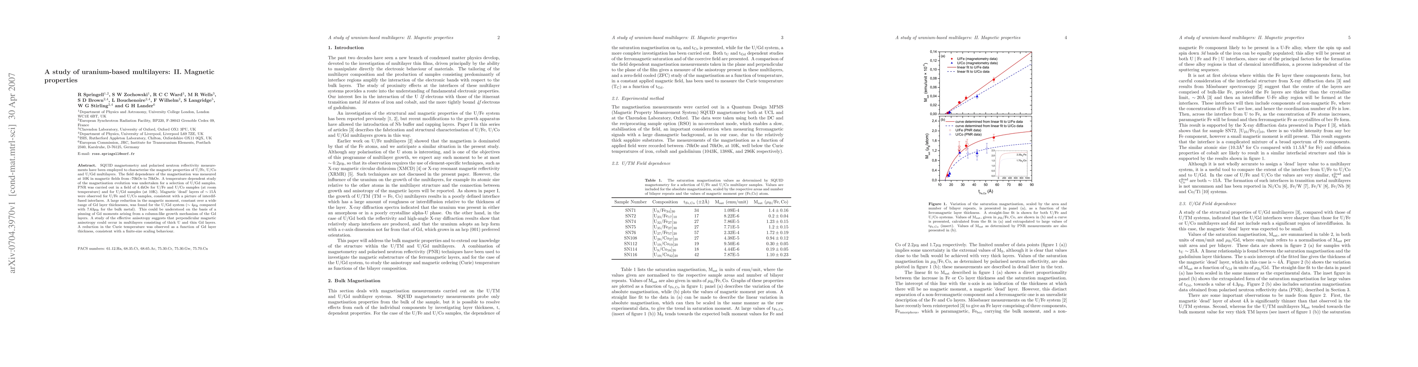 SQUID magnetometry and polarised neutron reflectivity measurements have been employed to characterise the magnetic properties of U/Fe, U/Co and U/Gd multilayers. The field dependence of the magnetisation was measured at 10K in magnetic fields from -70kOe to 70kOe. A temperature dependent study of the magnetisation evolution was undertaken for a selection of U/Gd samples. PNR was carried out in a field of 4.4kOe for U/Fe and U/Co samples (at room temperature) and for U/Gd samples (at 10K). Magnetic 'dead' layers of about 15 Angstrom were observed for U/Fe and U/Co samples, consistent with a picture of interdiffused interfaces. A large reduction in the magnetic moment, constant over a wide range of Gd layer thicknesses, was found for the U/Gd system (about 4 Bohr magnetons compared with 7.63 for the bulk metal). This could be understood on the basis of a pinning of Gd moments arising from a column-like growth mechanism of the Gd layers. A study of the effective anisotropy suggests that perpendicular magnetic anisotropy could occur in multilayers consisting of thick U and thin Gd layers. A reduction in the Curie temperature was observed as a function of Gd layer thickness, consistent with a finite-size scaling behaviour.