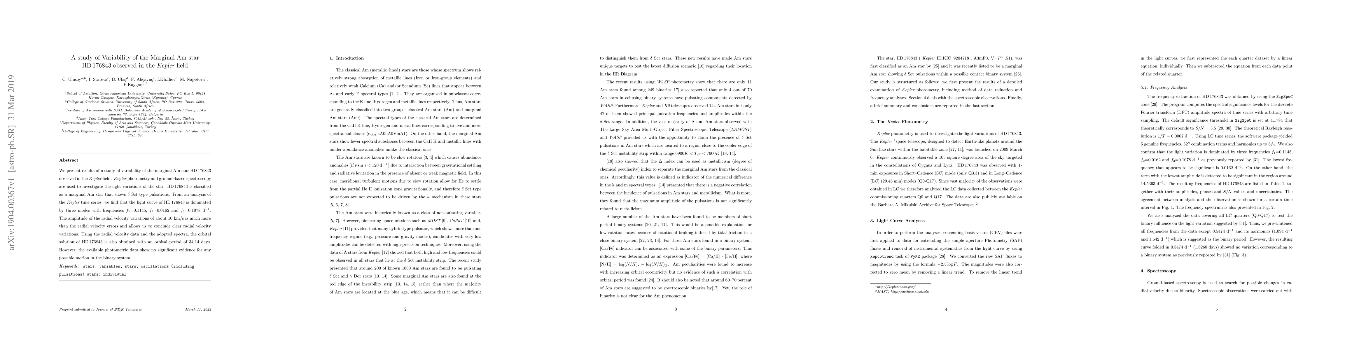 We present results of a study of the variability of the marginal Am star HD\,176843 observed in the {\it Kepler} field. {\it Kepler} photometry and ground-based spectroscopy are used to investigate the light variations of the star. HD\,176843 is classified as a marginal Am star that shows $\delta$\ Sct type pulsations. From an analysis of the {\it Kepler} time series, we find that the light curve of HD\,176843 is dominated by three modes with frequencies $f_{1}$=0.1145, $f_{2}$=0.0162 and $f_{3}$=0.1078 d$^{-1}$. The amplitude of the radial velocity variations of about 10 km/s is much more than the radial velocity errors and allows us to conclude clear radial velocity variations. Using the radial velocity data and the adopted spectra, the orbital solution of HD\,176843 is also obtained with an orbital period of 34.14 days. However, the available photometric data show no significant evidence for any possible motion in the binary system.