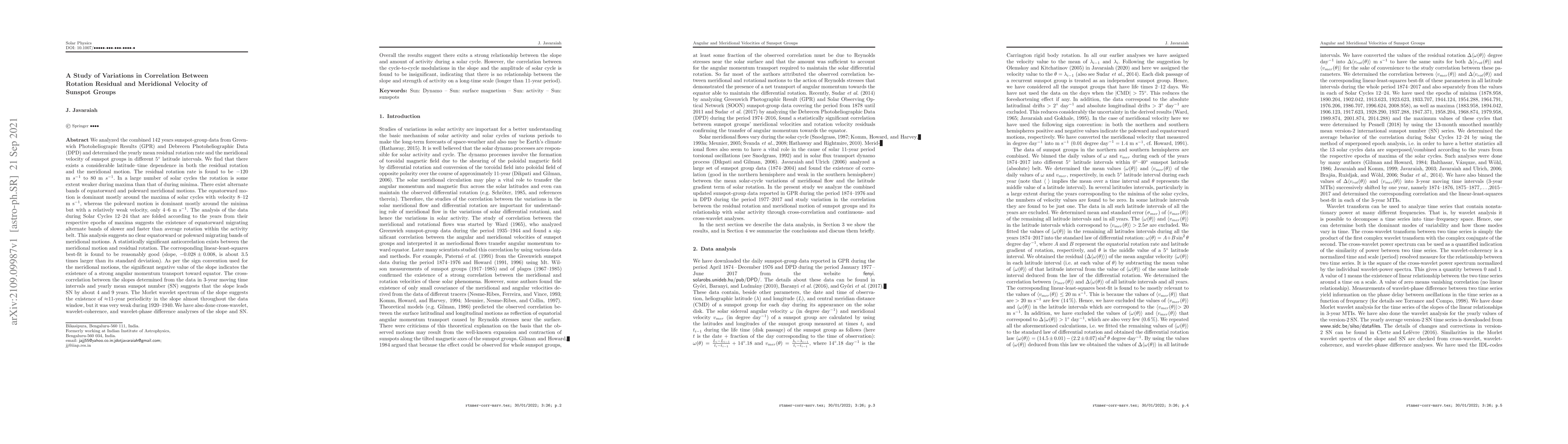 This study investigates the correlation between residual rotation and meridional velocity of sunspot groups over 142 years, revealing an anticorrelation with a significant negative slope indicating strong angular momentum transport toward the equator. The analysis shows a 11-year periodicity in the slope, leading sunspot number by 4-9 years, but no long-term relationship with the strength of solar activity.
