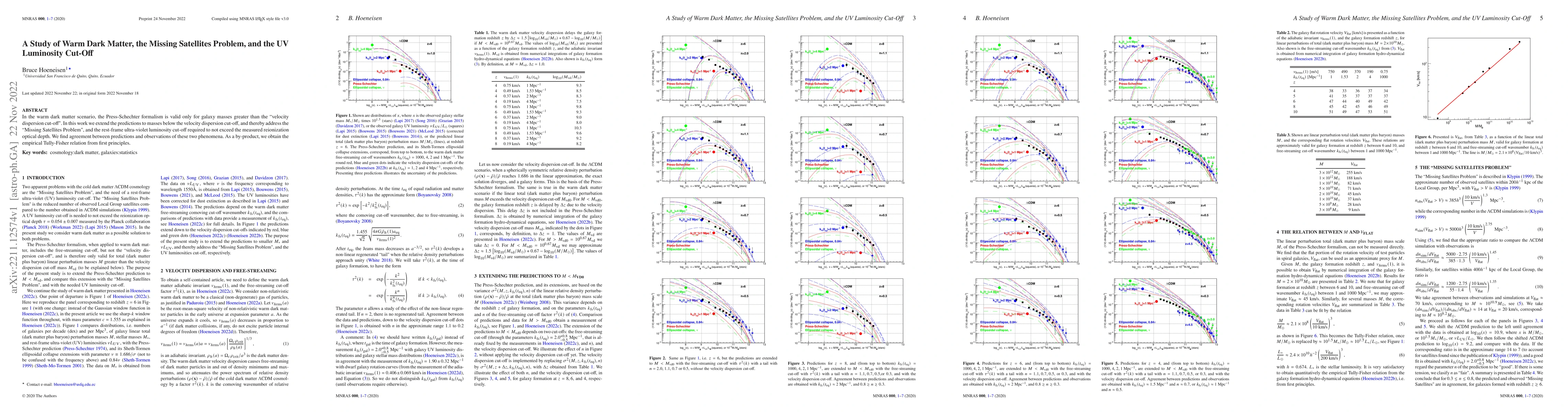 This study extends the warm dark matter model to lower galaxy masses, addressing the Missing Satellites Problem and the UV luminosity cut-off, achieving agreement with observations and deriving the Tully-Fisher relation empirically.
