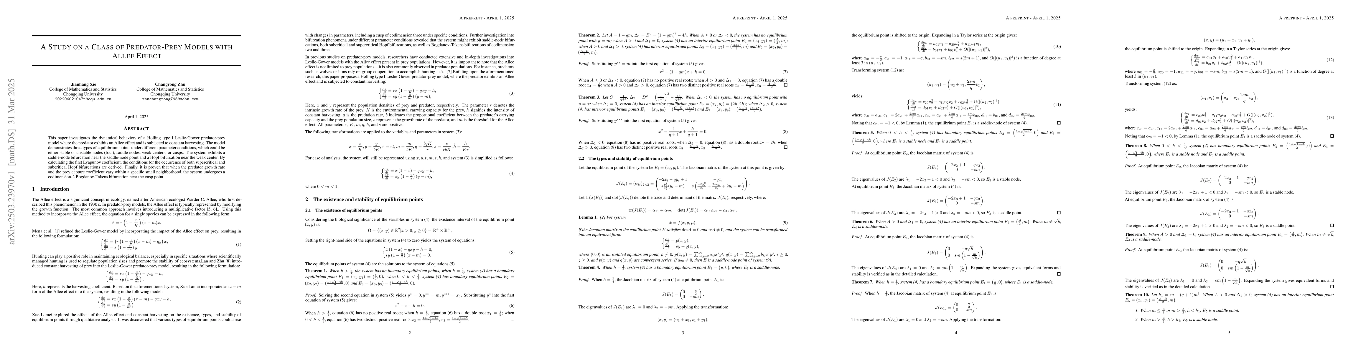 The work combines Allee effect, constant harvesting, and bifurcation theory in predator-prey models, proving a codimension-2 Bogdanov-Takens bifurcation near a cusp point.
