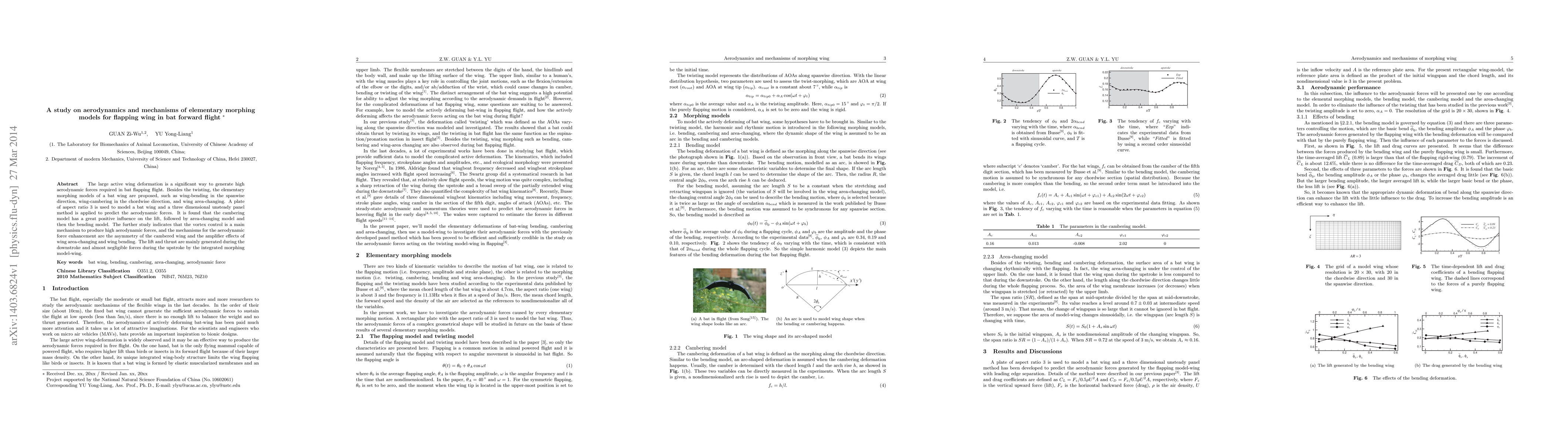 This study investigates elementary morphing models of bat wings, including wing-bending, wing-cambering, and wing area-changing, to generate high aerodynamic forces. The results show that cambering significantly enhances lift, followed by area-changing and bending, with vortex control being a key mechanism for aerodynamic force production.