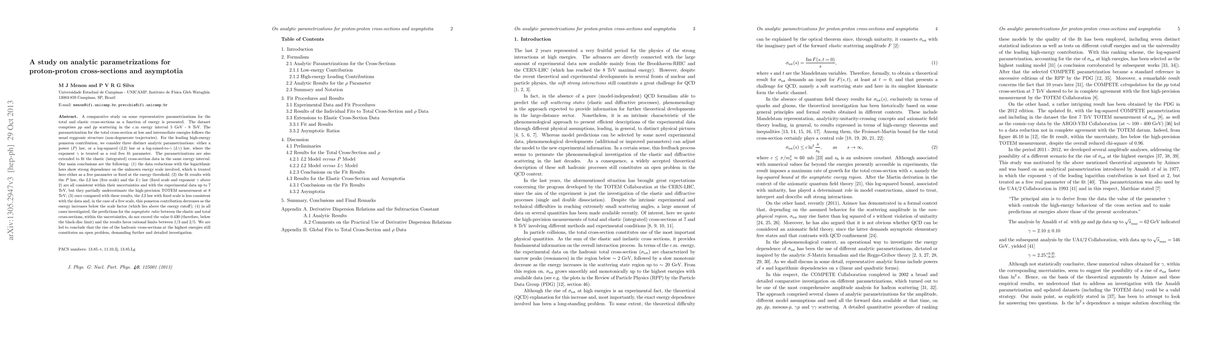 A comparative study on some representative parametrizations for the total and elastic cross-sections as a function of energy is presented. The dataset comprises pp and \bar{p}p scattering in the c.m energy interval 5 GeV-8 TeV. The parametrization for the total cross-section at low and intermediate energies follows the usual reggeonic structure (non-degenerate trajectories). For the leading high-energy pomeron contribution, we consider three distinct analytic parametrizations: either a power (P) law, or a log-squared (L2) law or a log-raised-to-gamma (Lgamma) law, where the exponent gamma is treated as a real free fit parameter. The parametrizations are also extended to fit the elastic (integrated) cross-section data in the same energy interval. Our main conclusions are the following: the data reductions with the logarithmic laws show strong dependence on the unknown energy scale involved, which is treated here either as a free parameter or fixed at the energy threshold; the fit results with the P law, the L2 law (free scale) and the Lgamma law (fixed scale and exponent gamma above 2) are all consistent within their uncertainties and with the experimental data up to 7 TeV, but they partially underestimate the high-precision TOTEM measurement at 8 TeV; once compared with these results, the L2 law with fixed scale is less consistent with the data and, in the case of a free scale, this pomeron contribution decreases as the energy increases below the scale factor (which lies above the energy cutoff); in all cases investigated, the predictions for the asymptotic ratio between the elastic and total cross-sections, within the uncertainties, do not exceed the value 0.430 (therefore, below the black-disc limit) and the results favor rational limits between 1/3 and 2/5. We are led to conclude that the rise of the hadronic cross-sections at the highest energies still constitutes an open problem.