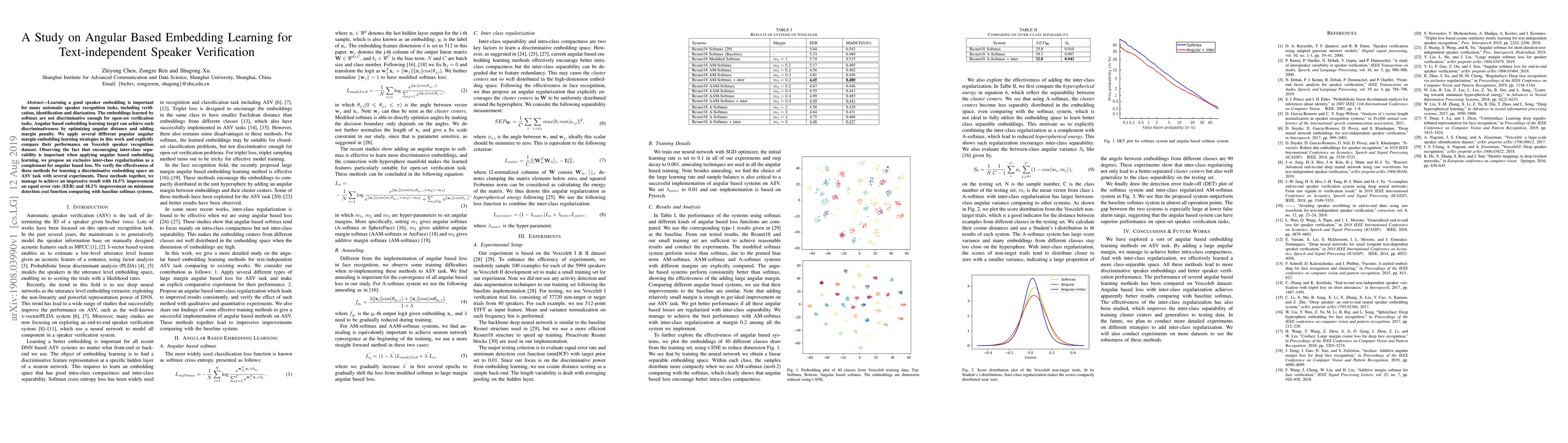 Learning a good speaker embedding is important for many automatic speaker recognition tasks, including verification, identification and diarization. The embeddings learned by softmax are not discriminative enough for open-set verification tasks. Angular based embedding learning target can achieve such discriminativeness by optimizing angular distance and adding margin penalty. We apply several different popular angular margin embedding learning strategies in this work and explicitly compare their performance on Voxceleb speaker recognition dataset. Observing the fact that encouraging inter-class separability is important when applying angular based embedding learning, we propose an exclusive inter-class regularization as a complement for angular based loss. We verify the effectiveness of these methods for learning a discriminative embedding space on ASV task with several experiments. These methods together, we manage to achieve an impressive result with 16.5% improvement on equal error rate (EER) and 18.2% improvement on minimum detection cost function comparing with baseline softmax systems.