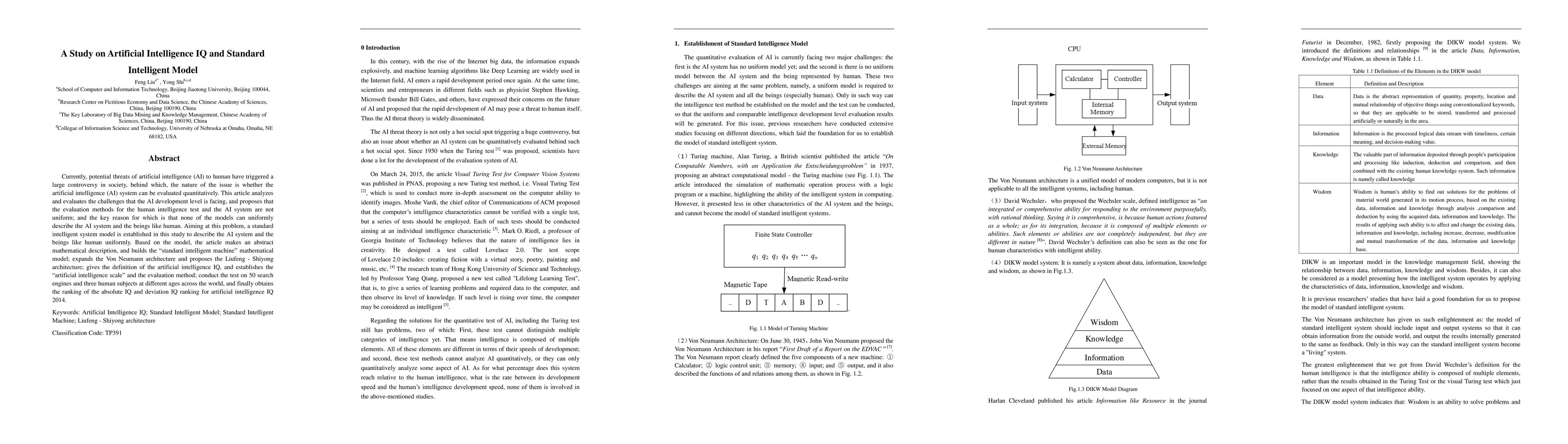 Currently, potential threats of artificial intelligence (AI) to human have triggered a large controversy in society, behind which, the nature of the issue is whether the artificial intelligence (AI) system can be evaluated quantitatively. This article analyzes and evaluates the challenges that the AI development level is facing, and proposes that the evaluation methods for the human intelligence test and the AI system are not uniform; and the key reason for which is that none of the models can uniformly describe the AI system and the beings like human. Aiming at this problem, a standard intelligent system model is established in this study to describe the AI system and the beings like human uniformly. Based on the model, the article makes an abstract mathematical description, and builds the standard intelligent machine mathematical model; expands the Von Neumann architecture and proposes the Liufeng - Shiyong architecture; gives the definition of the artificial intelligence IQ, and establishes the artificial intelligence scale and the evaluation method; conduct the test on 50 search engines and three human subjects at different ages across the world, and finally obtains the ranking of the absolute IQ and deviation IQ ranking for artificial intelligence IQ 2014.