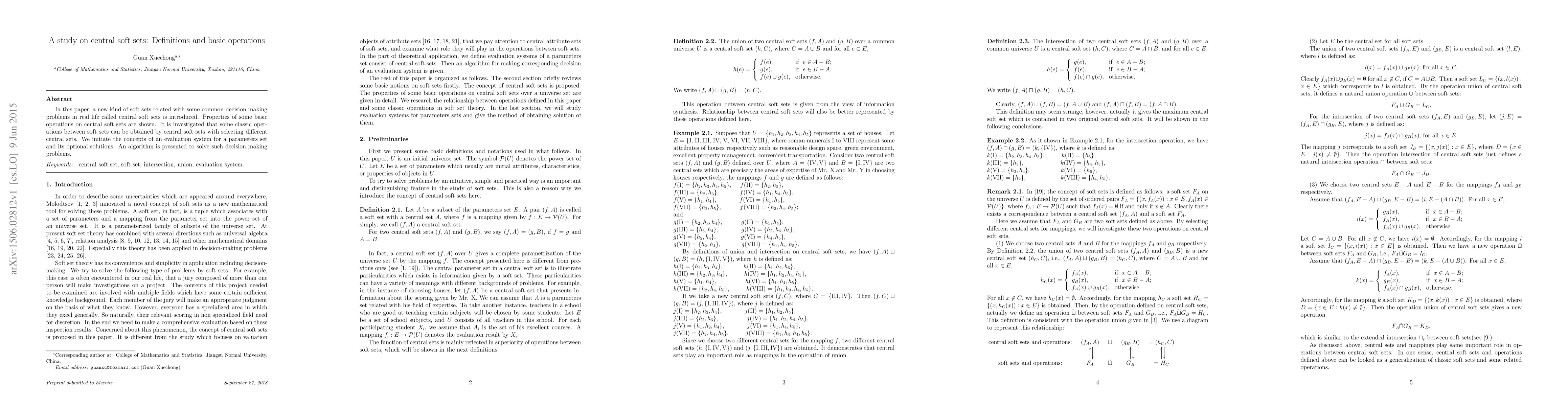 This paper introduces central soft sets, a novel type of soft set for decision making, and explores their basic operations. It demonstrates how classic soft set operations can be derived from central soft sets by selecting appropriate central sets, and presents an algorithm for solving decision-making problems.