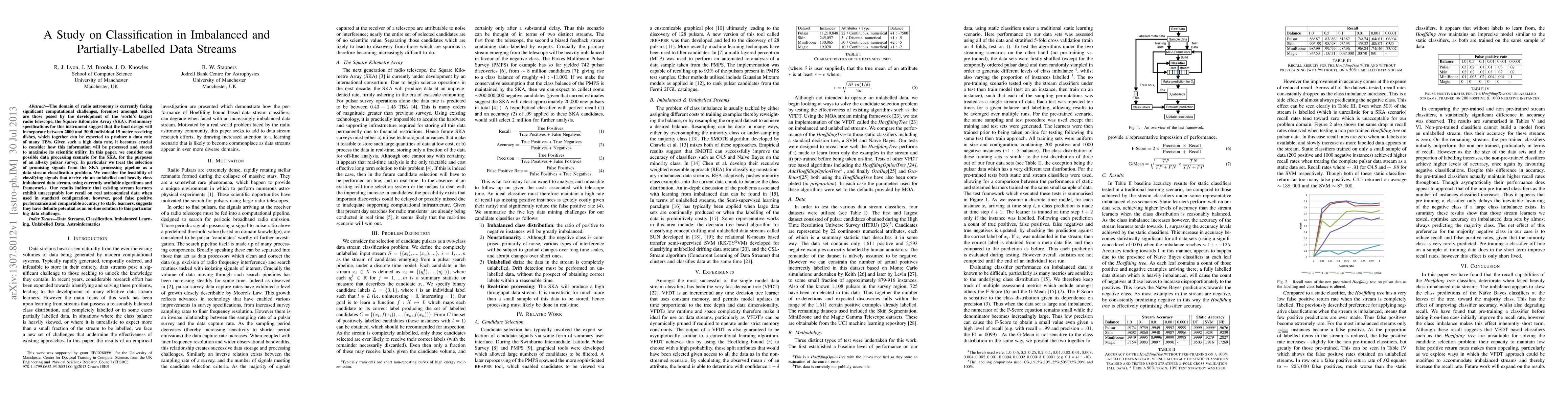 The domain of radio astronomy is currently facing significant computational challenges, foremost amongst which are those posed by the development of the world's largest radio telescope, the Square Kilometre Array (SKA). Preliminary specifications for this instrument suggest that the final design will incorporate between 2000 and 3000 individual 15 metre receiving dishes, which together can be expected to produce a data rate of many TB/s. Given such a high data rate, it becomes crucial to consider how this information will be processed and stored to maximise its scientific utility. In this paper, we consider one possible data processing scenario for the SKA, for the purposes of an all-sky pulsar survey. In particular we treat the selection of promising signals from the SKA processing pipeline as a data stream classification problem. We consider the feasibility of classifying signals that arrive via an unlabelled and heavily class imbalanced data stream, using currently available algorithms and frameworks. Our results indicate that existing stream learners exhibit unacceptably low recall on real astronomical data when used in standard configuration; however, good false positive performance and comparable accuracy to static learners, suggests they have definite potential as an on-line solution to this particular big data challenge.