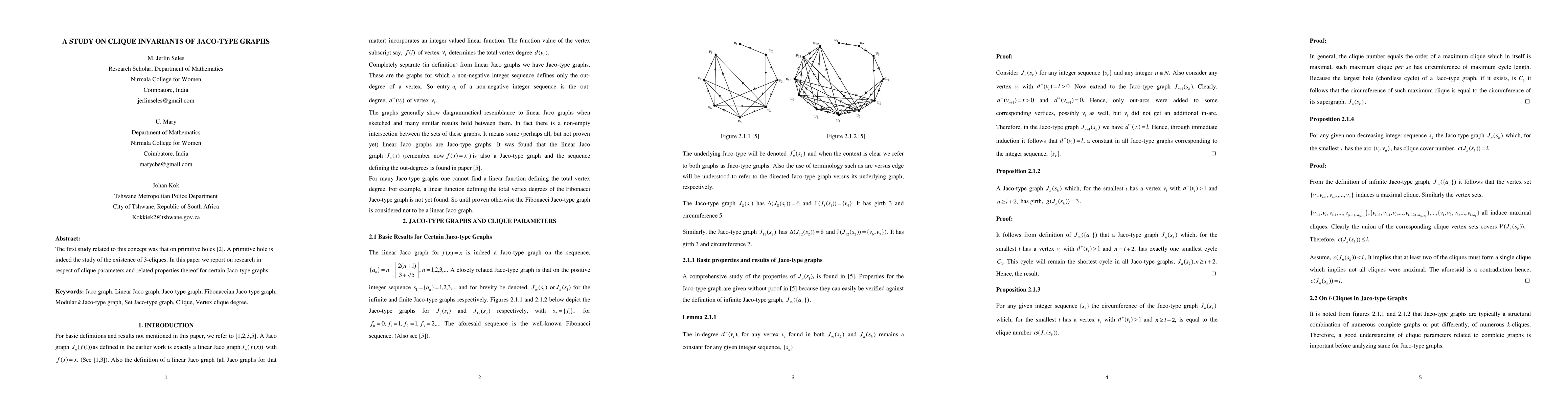 Summary: This study investigates the clique invariants and related properties of Jaco-type graphs, building on the initial concept of primitive holes to explore their structural characteristics.