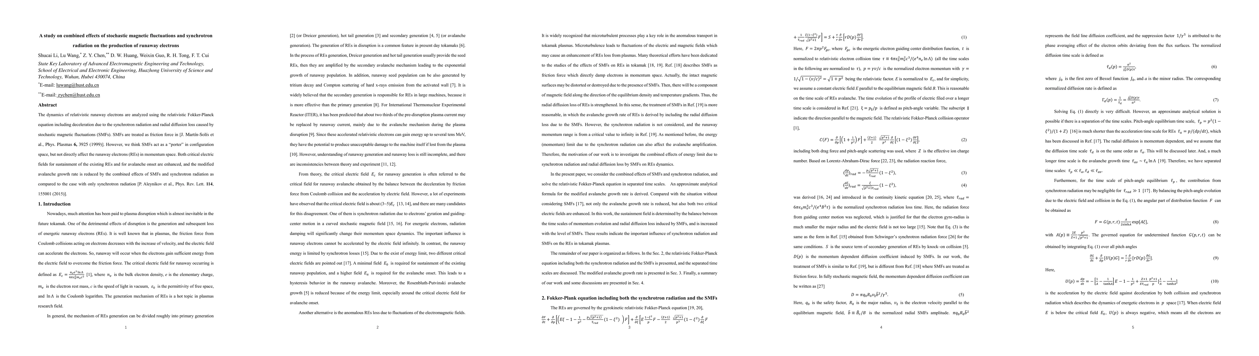 Research investigates how stochastic magnetic fluctuations and synchrotron radiation affect runaway electrons in a plasma, finding that their combined effects reduce avalanche growth rates. This has implications for the stability of relativistic electron beams in various applications.