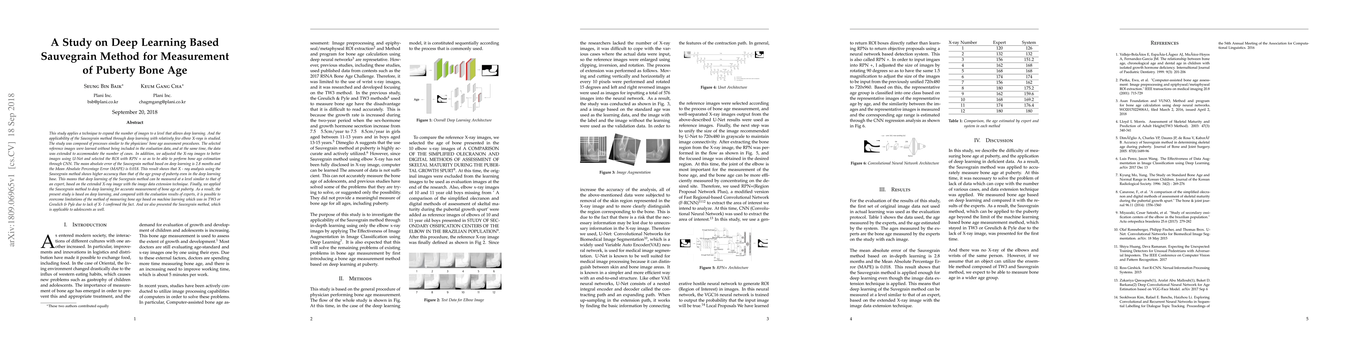 This study applies a technique to expand the number of images to a level that allows deep learning. And the applicability of the Sauvegrain method through deep learning with relatively few elbow X-rays is studied. The study was composed of processes similar to the physicians' bone age assessment procedures. The selected reference images were learned without being included in the evaluation data, and at the same time, the data was extended to accommodate the number of cases. In addition, we adjusted the X-ray images to better images using U-Net and selected the ROI with RPN + so as to be able to perform bone age estimation through CNN. The mean absolute error of the Sauvegrain method based on deep learning is 2.8 months and the Mean Absolute Percentage Error (MAPE) is 0.018. This result shows that X - ray analysis using the Sauvegrain method shows higher accuracy than that of the age group of puberty even in the deep learning base. This means that deep learning of the Suvegrain method can be measured at a level similar to that of an expert, based on the extended X-ray image with the image data extension technique. Finally, we applied the Sauvegrain method to deep learning for accurate measurement of bone age at puberty. As a result, the present study is based on deep learning, and compared with the evaluation results of experts, it is possible to overcome limitations of the method of measuring bone age based on machine learning which was in TW3 or Greulich & Pyle due to lack of X- I confirmed the fact. And we also presented the Sauvegrain method, which is applicable to adolescents as well.