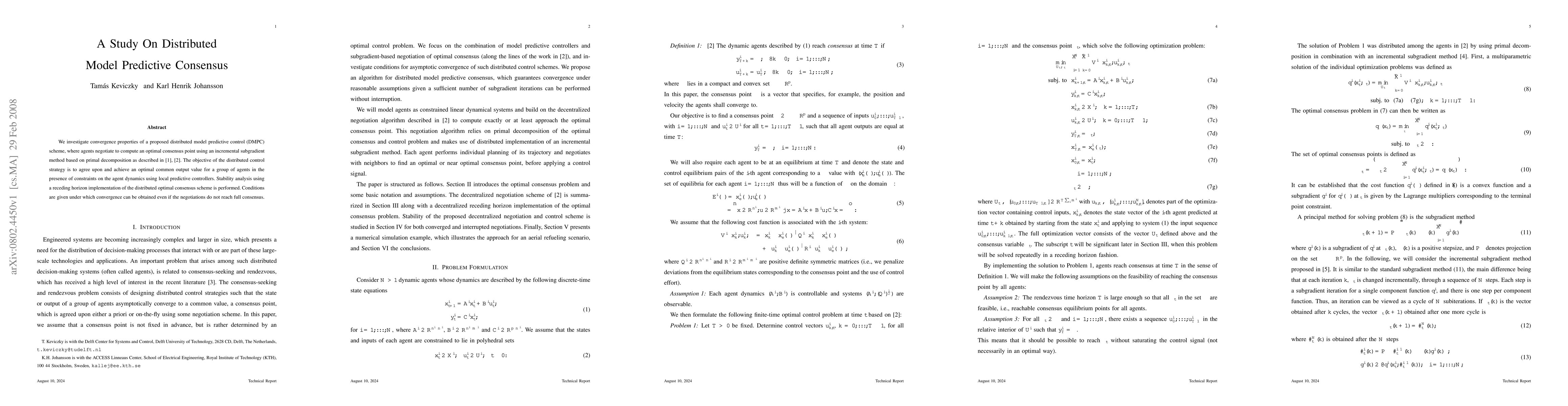 We investigate convergence properties of a proposed distributed model predictive control (DMPC) scheme, where agents negotiate to compute an optimal consensus point using an incremental subgradient method based on primal decomposition as described in Johansson et al. [2006, 2007]. The objective of the distributed control strategy is to agree upon and achieve an optimal common output value for a group of agents in the presence of constraints on the agent dynamics using local predictive controllers. Stability analysis using a receding horizon implementation of the distributed optimal consensus scheme is performed. Conditions are given under which convergence can be obtained even if the negotiations do not reach full consensus.