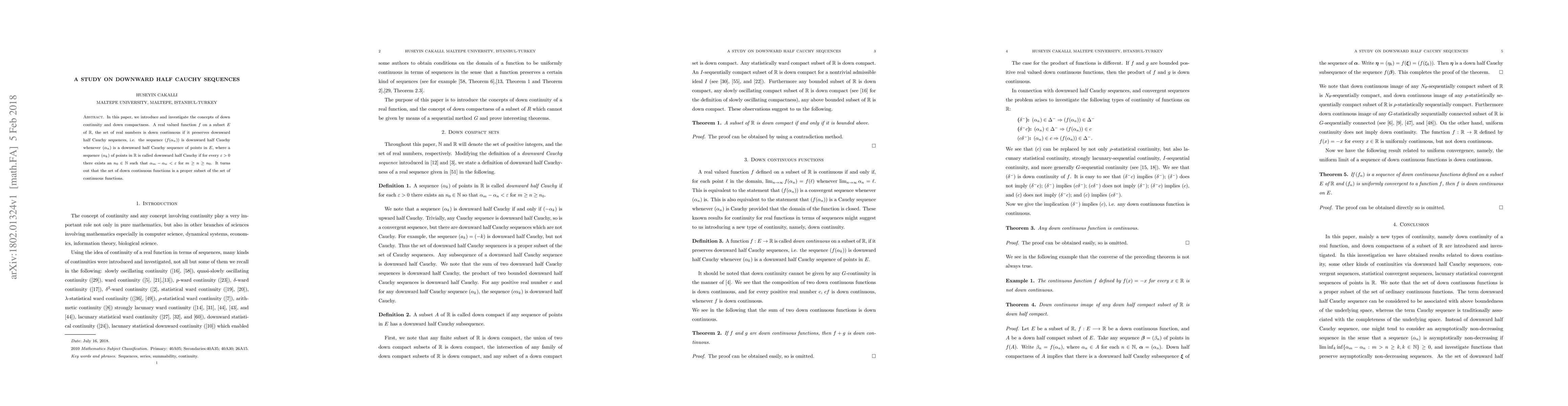 This paper explores the concepts of down continuity and down compactness, defining a real-valued function as down continuous if it preserves downward half Cauchy sequences. It finds that down continuous functions form a subset of continuous functions.