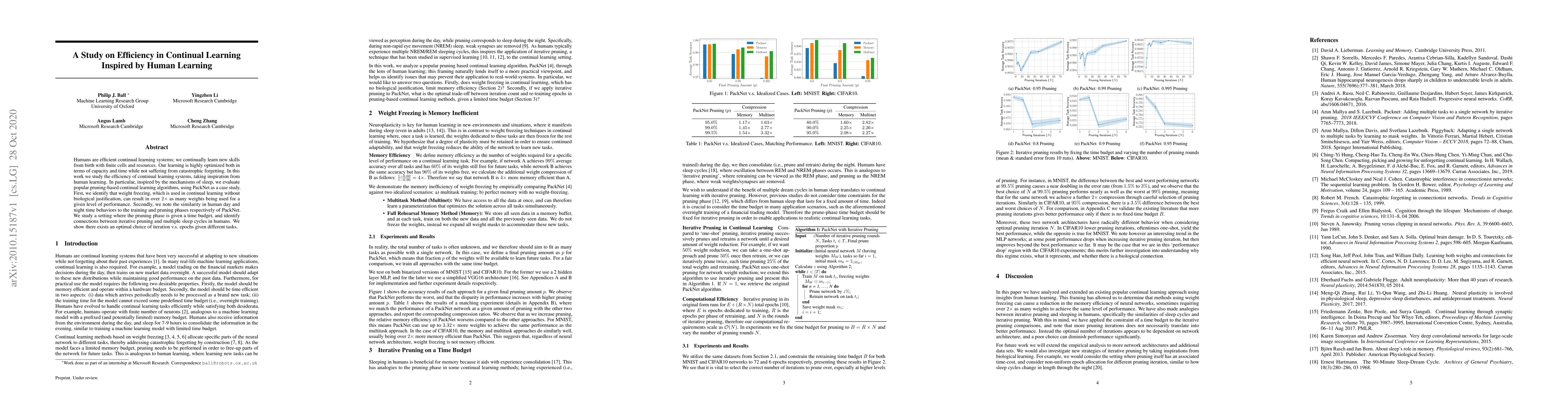 Humans are efficient continual learning systems; we continually learn new skills from birth with finite cells and resources. Our learning is highly optimized both in terms of capacity and time while not suffering from catastrophic forgetting. In this work we study the efficiency of continual learning systems, taking inspiration from human learning. In particular, inspired by the mechanisms of sleep, we evaluate popular pruning-based continual learning algorithms, using PackNet as a case study. First, we identify that weight freezing, which is used in continual learning without biological justification, can result in over $2\times$ as many weights being used for a given level of performance. Secondly, we note the similarity in human day and night time behaviors to the training and pruning phases respectively of PackNet. We study a setting where the pruning phase is given a time budget, and identify connections between iterative pruning and multiple sleep cycles in humans. We show there exists an optimal choice of iteration v.s. epochs given different tasks.