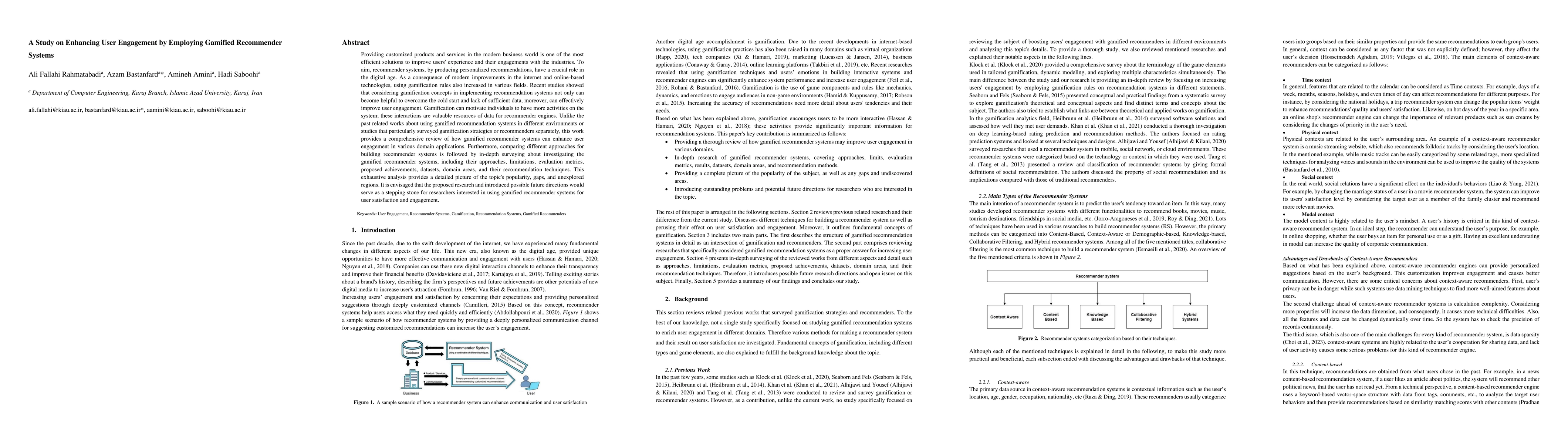 Providing customized products and services in the modern business world is one of the most efficient solutions to improve users' experience and their engagements with the industries. To aim, recommender systems, by producing personalized recommendations, have a crucial role in the digital age. As a consequence of modern improvements in the internet and online-based technologies, using gamification rules also increased in various fields. Recent studies showed that considering gamification concepts in implementing recommendation systems not only can become helpful to overcome the cold start and lack of sufficient data, moreover, can effectively improve user engagement. Gamification can motivate individuals to have more activities on the system; these interactions are valuable resources of data for recommender engines. Unlike the past related works about using gamified recommendation systems in different environments or studies that particularly surveyed gamification strategies or recommenders separately, this work provides a comprehensive review of how gamified recommender systems can enhance user engagement in various domain applications. Furthermore, comparing different approaches for building recommender systems is followed by in-depth surveying about investigating the gamified recommender systems, including their approaches, limitations, evaluation metrics, proposed achievements, datasets, domain areas, and their recommendation techniques. This exhaustive analysis provides a detailed picture of the topic's popularity, gaps, and unexplored regions. It is envisaged that the proposed research and introduced possible future directions would serve as a stepping stone for researchers interested in using gamified recommender systems for user satisfaction and engagement.