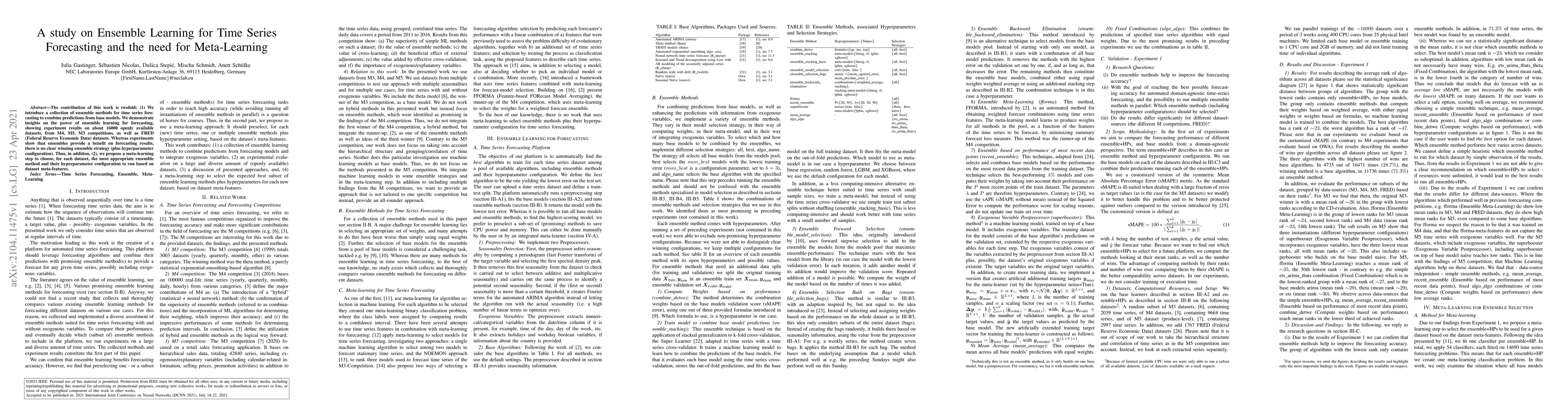 This study introduces ensemble methods for time series forecasting and demonstrates their effectiveness across numerous datasets. It also proposes a meta-learning approach to dynamically select the best ensemble method and hyperparameters based on dataset characteristics.