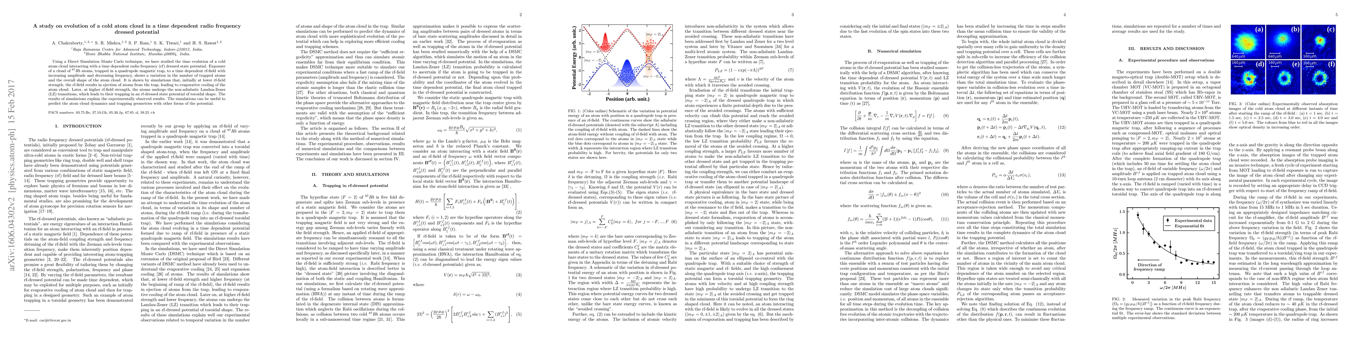 This study uses Direct Simulation Monte Carlo to analyze the evolution of a cold $^{87}Rb$ atom cloud in a time-dependent radio frequency dressed potential, revealing evaporative cooling and toroidal trapping via Landau-Zener transitions. The simulations provide insights into atom cloud dynamics and potential geometries.