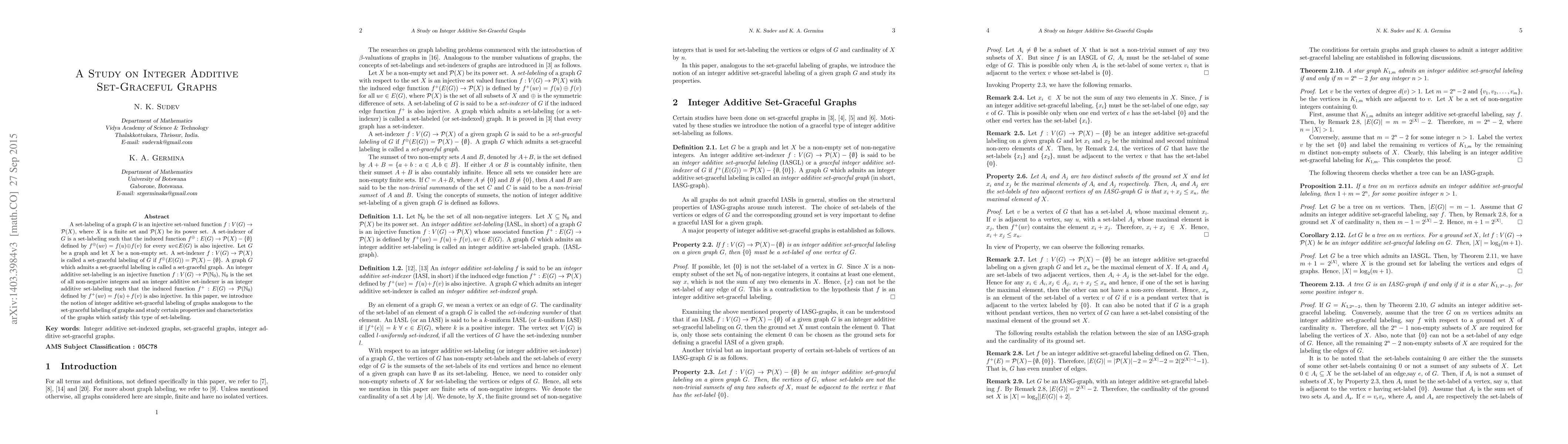 This paper explores the concept of integer additive set-graceful labelings in graphs, where vertices are labeled with non-negative integers such that the sum of labels on edges remains injective and unique. The study extends traditional set-graceful labeling to this new framework and presents some initial findings.