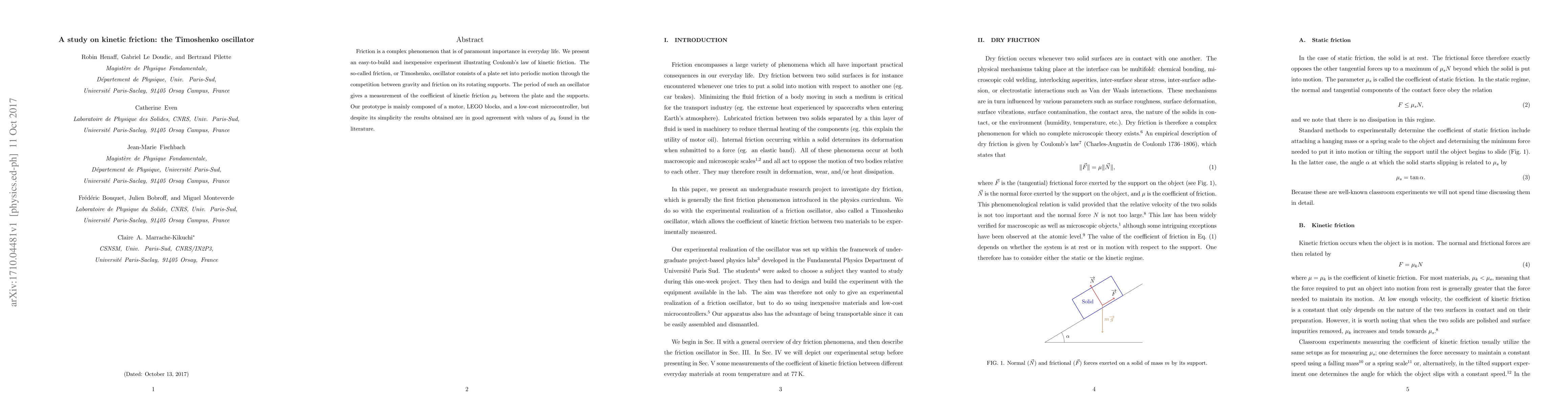Friction is a complex phenomenon that is of paramount importance in everyday life. We present an easy-to-build and inexpensive experiment illustrating Coulomb's law of kinetic friction. The so-called friction, or Timoshenko, oscillator consists of a plate set into periodic motion through the competition between gravity and friction on its rotating supports. The period of such an oscillator gives a measurement of the coefficient of kinetic friction \mu_k between the plate and the supports. Our prototype is mainly composed of a motor, LEGO blocks, and a low-cost microcontroller, but despite its simplicity the results obtained are in good agreement with values of \mu_k found in the literature.
