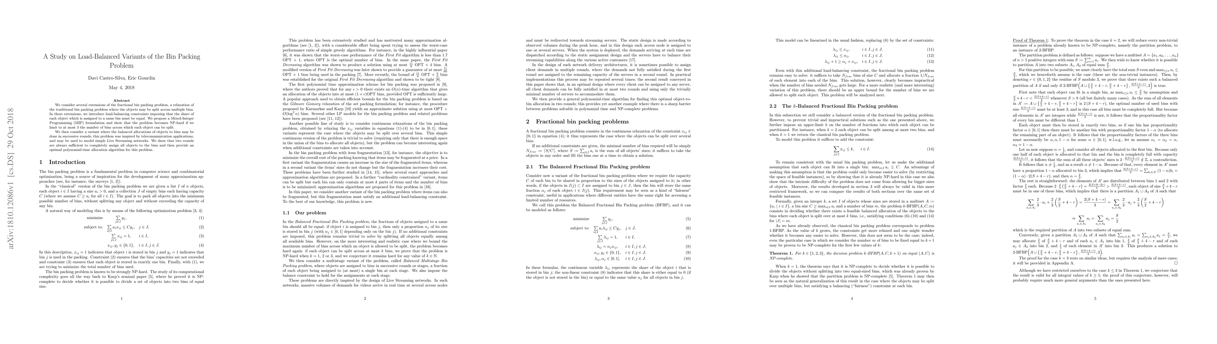 We consider several extensions of the fractional bin packing problem, a relaxation of the traditional bin packing problem where the objects may be split across multiple bins. In these extensions, we introduce load-balancing constraints imposing that the share of each object which is assigned to a same bin must be equal. We propose a Mixed-Integer Programming (MIP) formulation and show that the problem becomes NP-hard if we limit to at most 3 the number of bins across which each object can be split. We then consider a variant where the balanced allocations of objects to bins may be done in successive rounds; this problem was inspired by telecommunication applications, and may be used to model simple Live Streaming networks. We show that two rounds are always sufficient to completely assign all objects to the bins and then provide an optimal polynomial-time allocation algorithm for this problem.
