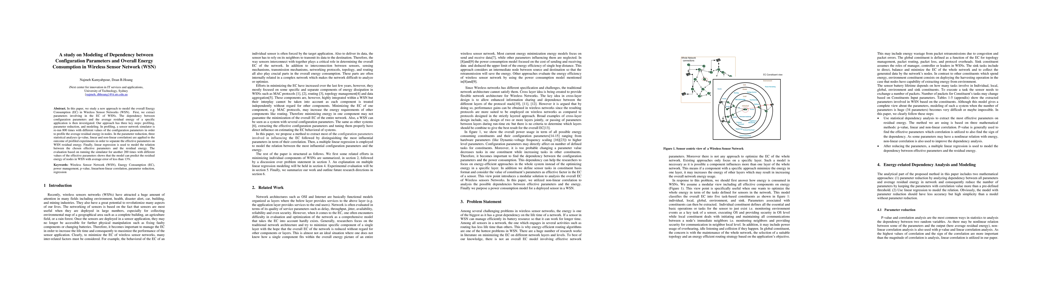 This study models the dependency between configuration parameters and energy consumption in Wireless Sensor Networks (WSN) by profiling, reducing parameters through statistical analysis, and using linear regression to predict residual energy with an average error of less than 13%.