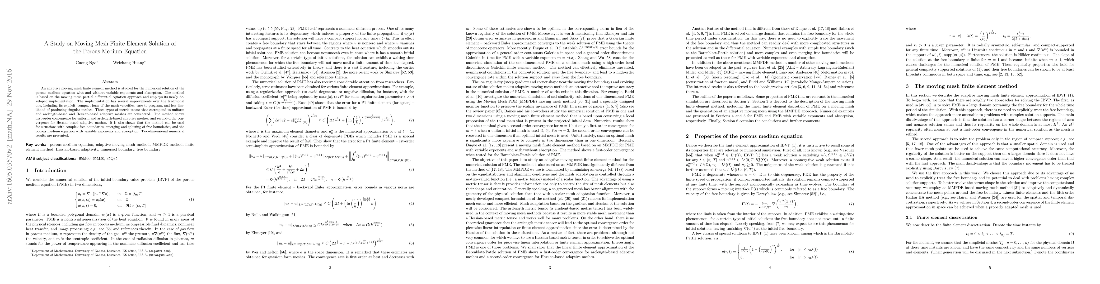 This study explores an adaptive moving mesh finite element method for solving the porous medium equation, demonstrating first-order convergence for uniform and arclength-based meshes, and second-order convergence for Hessian-based adaptive meshes. The method effectively handles complex free boundaries and variable exponents with absorption, as shown through two-dimensional numerical results.