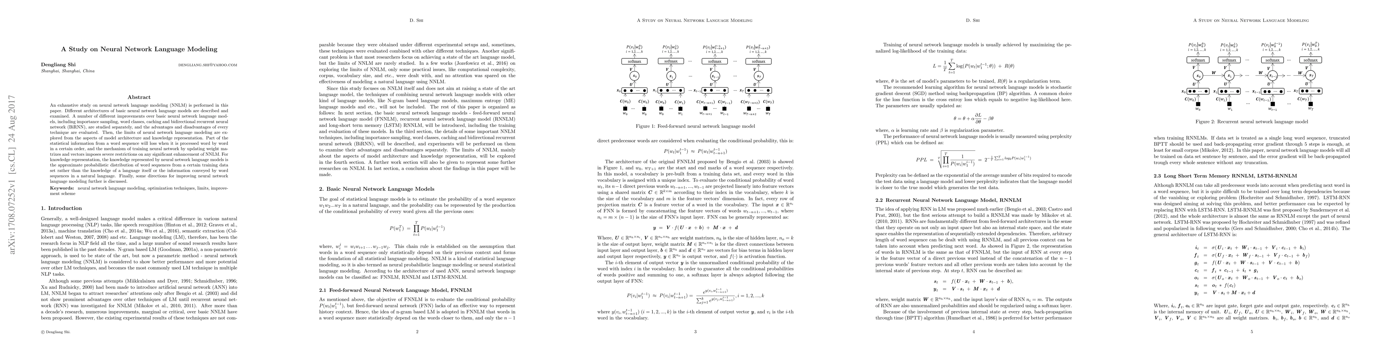 This paper examines various neural network language modeling architectures and techniques, assessing improvements like importance sampling and bidirectional RNNs. It highlights limitations in model architecture and knowledge representation, suggesting future directions for enhancement.