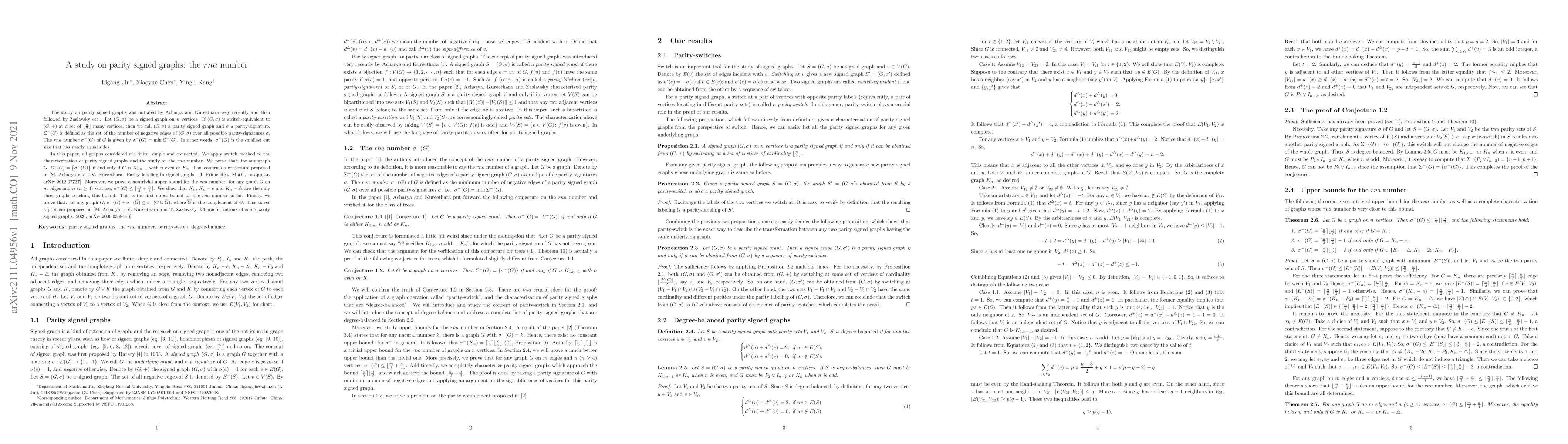 This paper studies parity signed graphs and introduces the $rna$ number, defined as the minimum cut size with nearly equal sides. The authors prove that $\Sigma^{-}(G)=\left\{\sigma^{-}(G)\right\}$ if and only if $G$ is a star or complete graph, confirming a conjecture. They also establish the first nontrivial upper bound for the $rna$ number and show that $K_n$, $K_n-e$, and $K_n-\triangle$ reach this bound. Additionally, the paper proves a relationship between the $rna$ number of a graph and its complement.