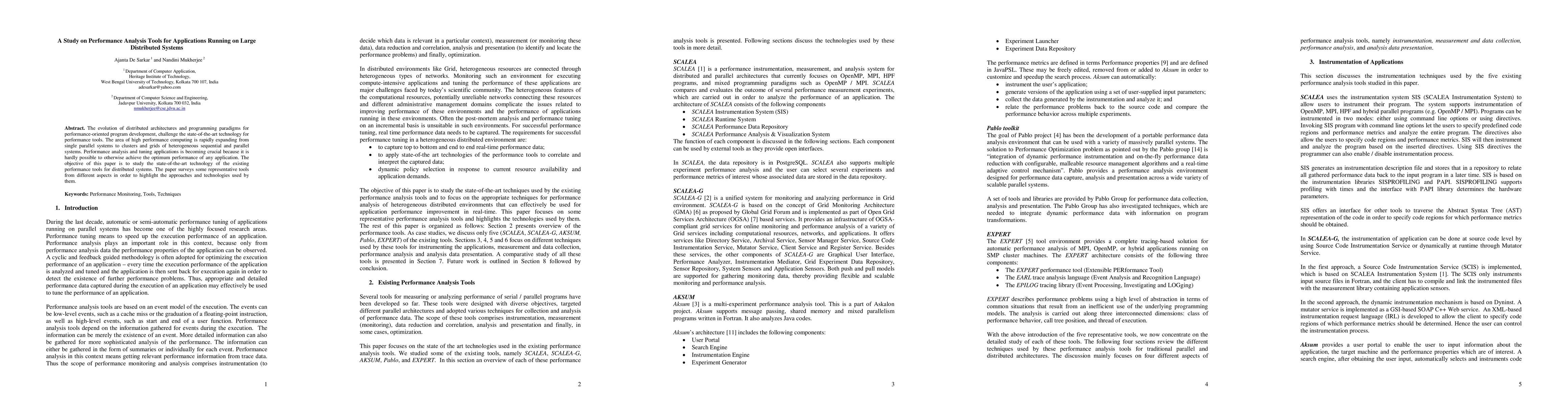 This paper surveys state-of-the-art performance analysis tools for applications in large distributed systems, highlighting the evolving challenges and technologies used to optimize performance in high-performance computing environments. It aims to provide insights into the approaches and tools that facilitate performance tuning in complex, heterogeneous distributed architectures.