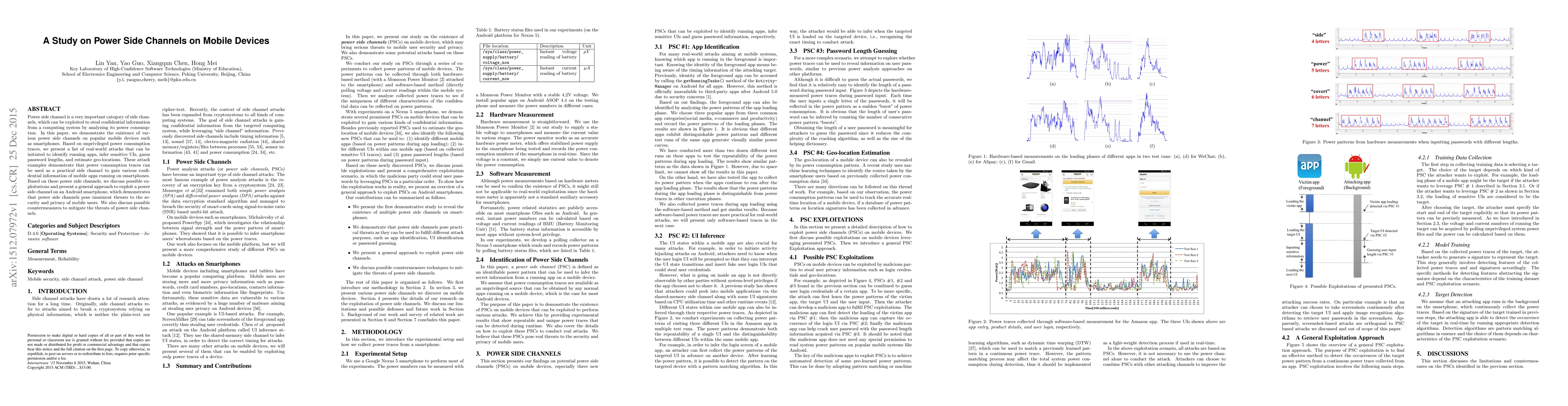 This study reveals various power side channels on popular mobile devices, demonstrating real-world attacks that can exploit power consumption traces to identify running apps, infer sensitive UIs, guess password lengths, and estimate geo-locations, highlighting significant security and privacy threats. The paper also discusses countermeasures to mitigate these threats.