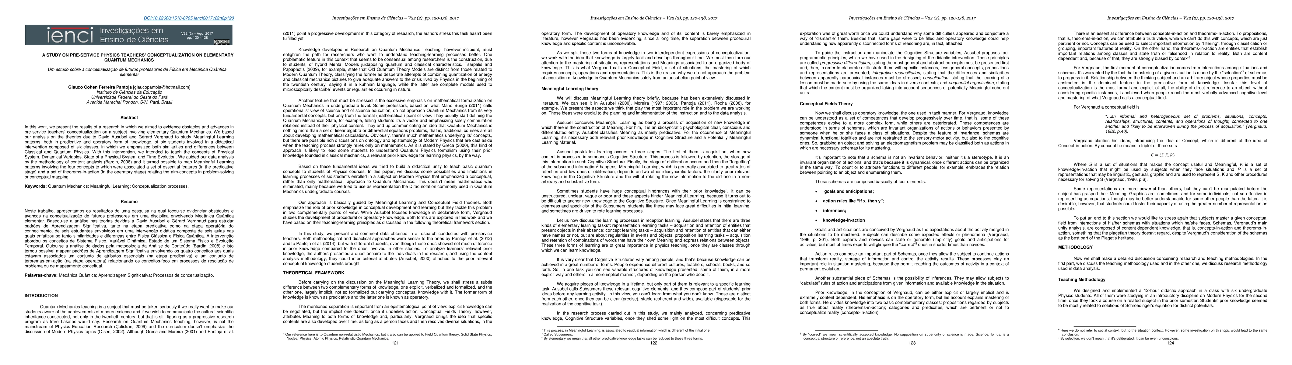 In this work, we present the results of a research in which we aimed to evidence obstacles and advances in pre-service teachers' conceptualization on a subject involving elementary Quantum Mechanics. We based our analysis on the theories due to David Ausubel and G\`erard Vergnaud to study Meaningful Learning patterns, both in predicative and operator form of knowledge, of six students involved in a didactical intervention composed of six classes, in which we emphasized both similarities and differences between Classical and Quantum Physics. With this intervention, we intended to teach the concepts of Physical Systems, Dynamical Variables, State of a Physical System and Time Evolution. We guided our data analysis by the methodology of content analysis and it turned possible to map Meaningful Learning patterns involving the four concepts to which were associated a set of essential features in the predicative stage and a set of theorems-in-action in the operatory stage relating the aim-concepts in problem-solbing or conceptual mapping.